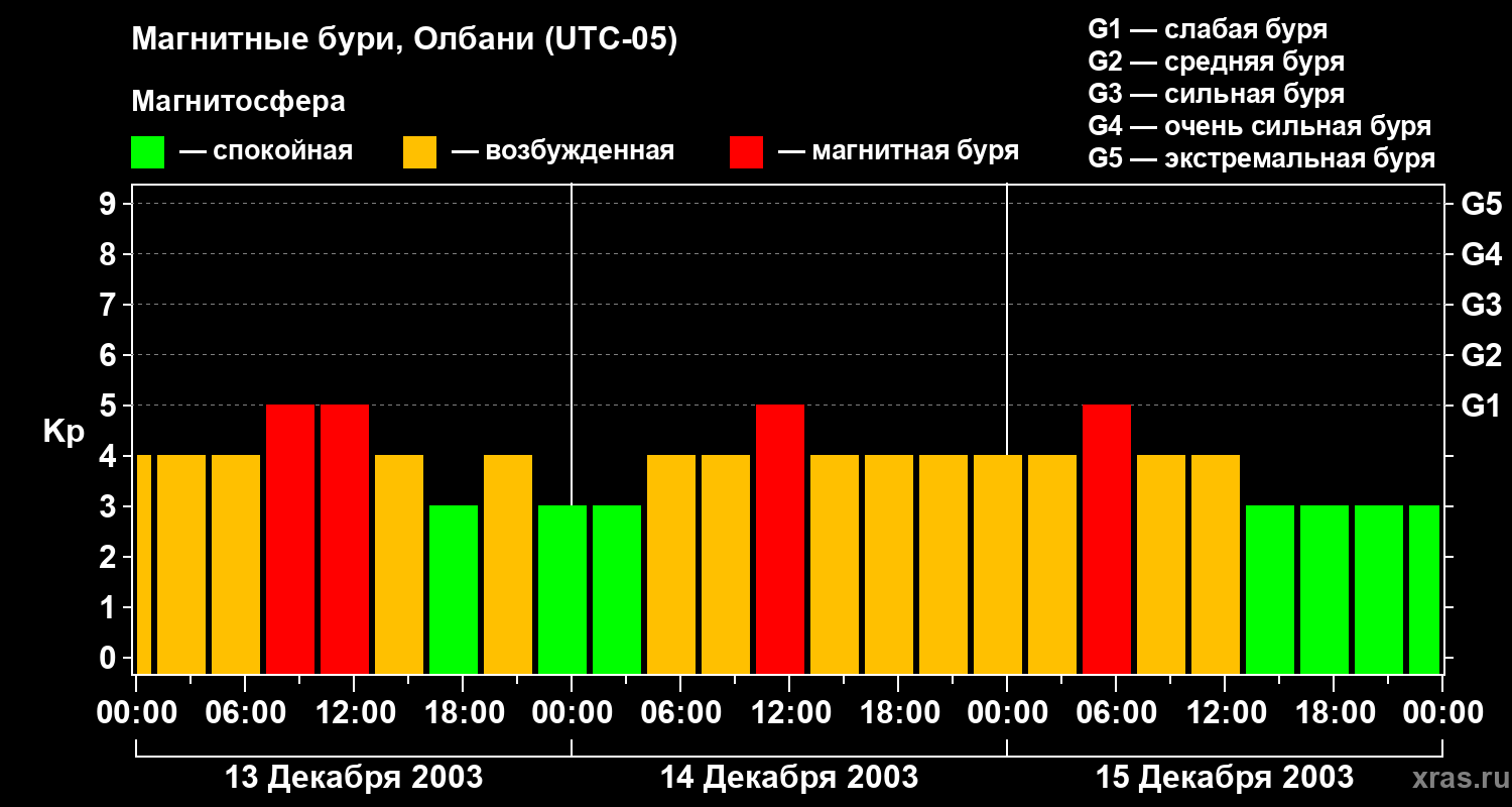 Изменения геомагнитного индекса Kp с 13 по 15 декабря 2003 года для средних широт