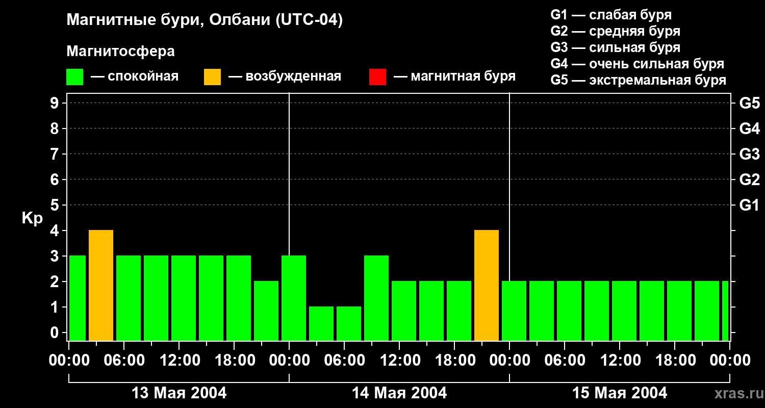 Изменения геомагнитного индекса Kp с 13 по 15 мая 2004 года для средних широт