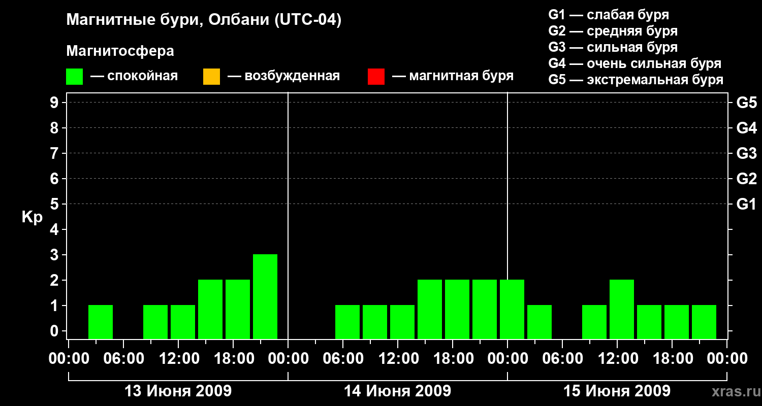Изменения геомагнитного индекса Kp с 13 по 15 июня 2009 года для средних широт