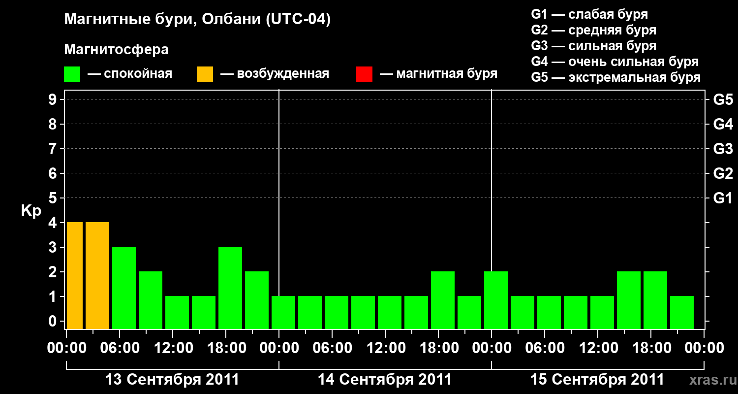 Изменения геомагнитного индекса Kp с 13 по 15 сентября 2011 года для средних широт