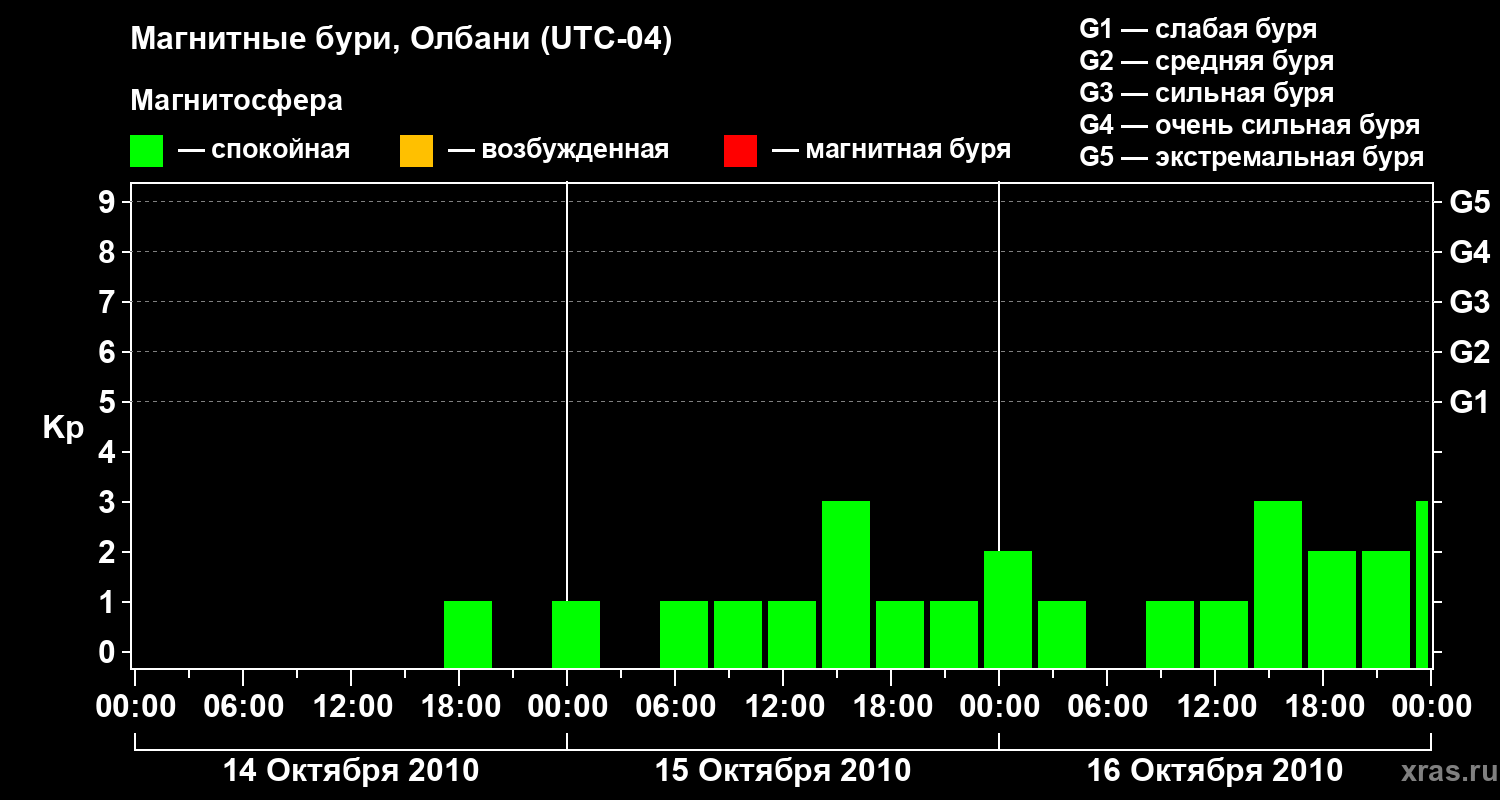 Изменения геомагнитного индекса Kp с 14 по 16 октября 2010 года для средних широт