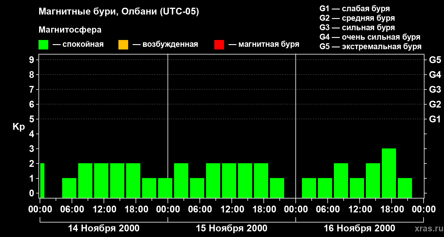 Изменения геомагнитного индекса Kp с 14 по 16 ноября 2000 года для средних широт