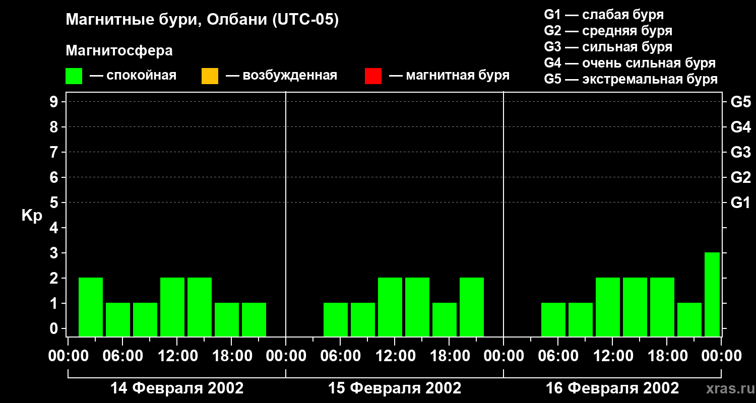 Изменения геомагнитного индекса Kp с 14 по 16 февраля 2002 года для средних широт