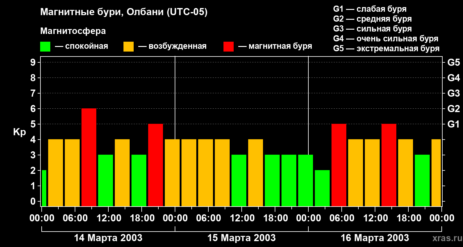 Изменения геомагнитного индекса Kp с 14 по 16 марта 2003 года для средних широт