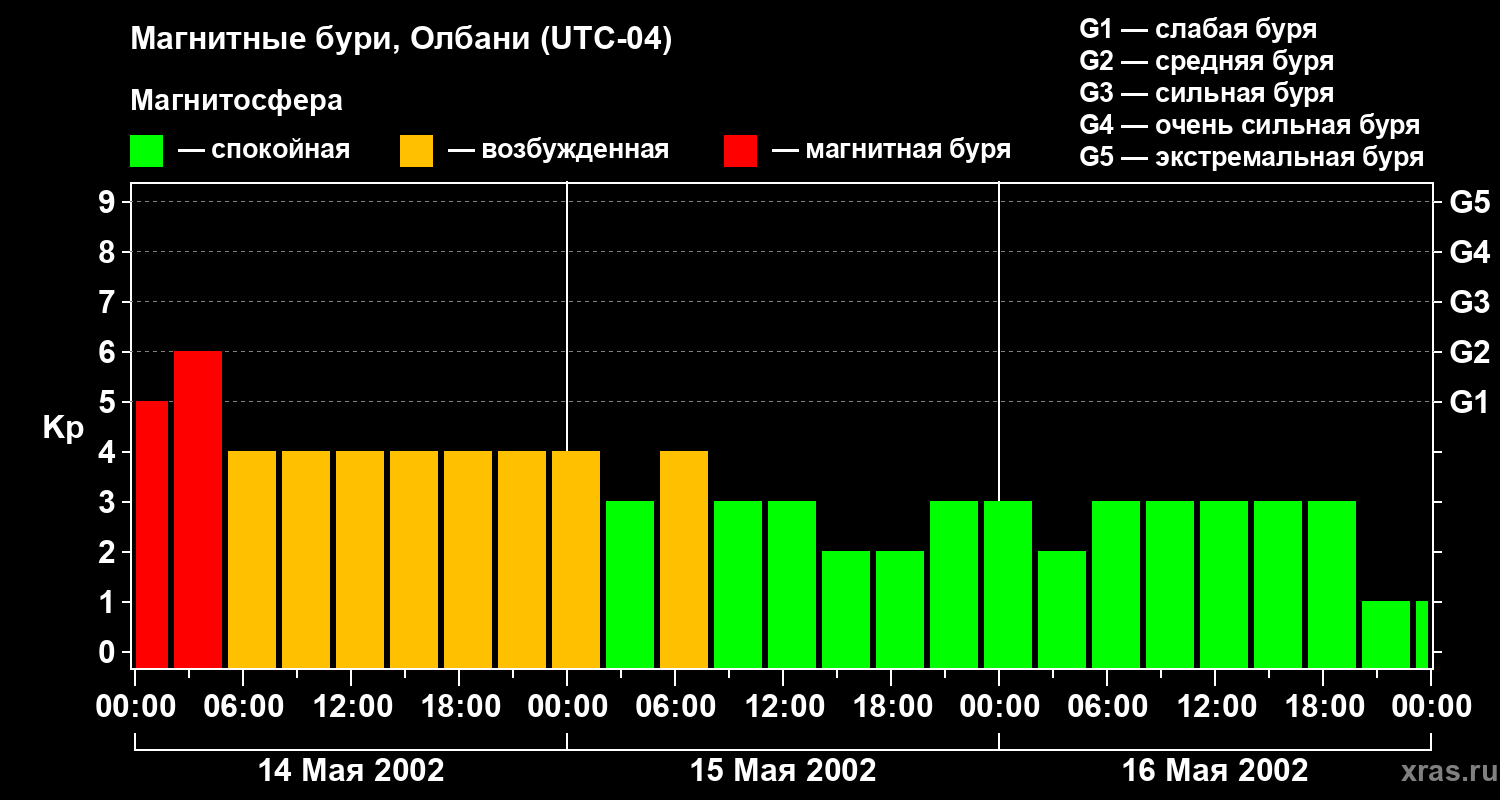 Изменения геомагнитного индекса Kp с 14 по 16 мая 2002 года для средних широт