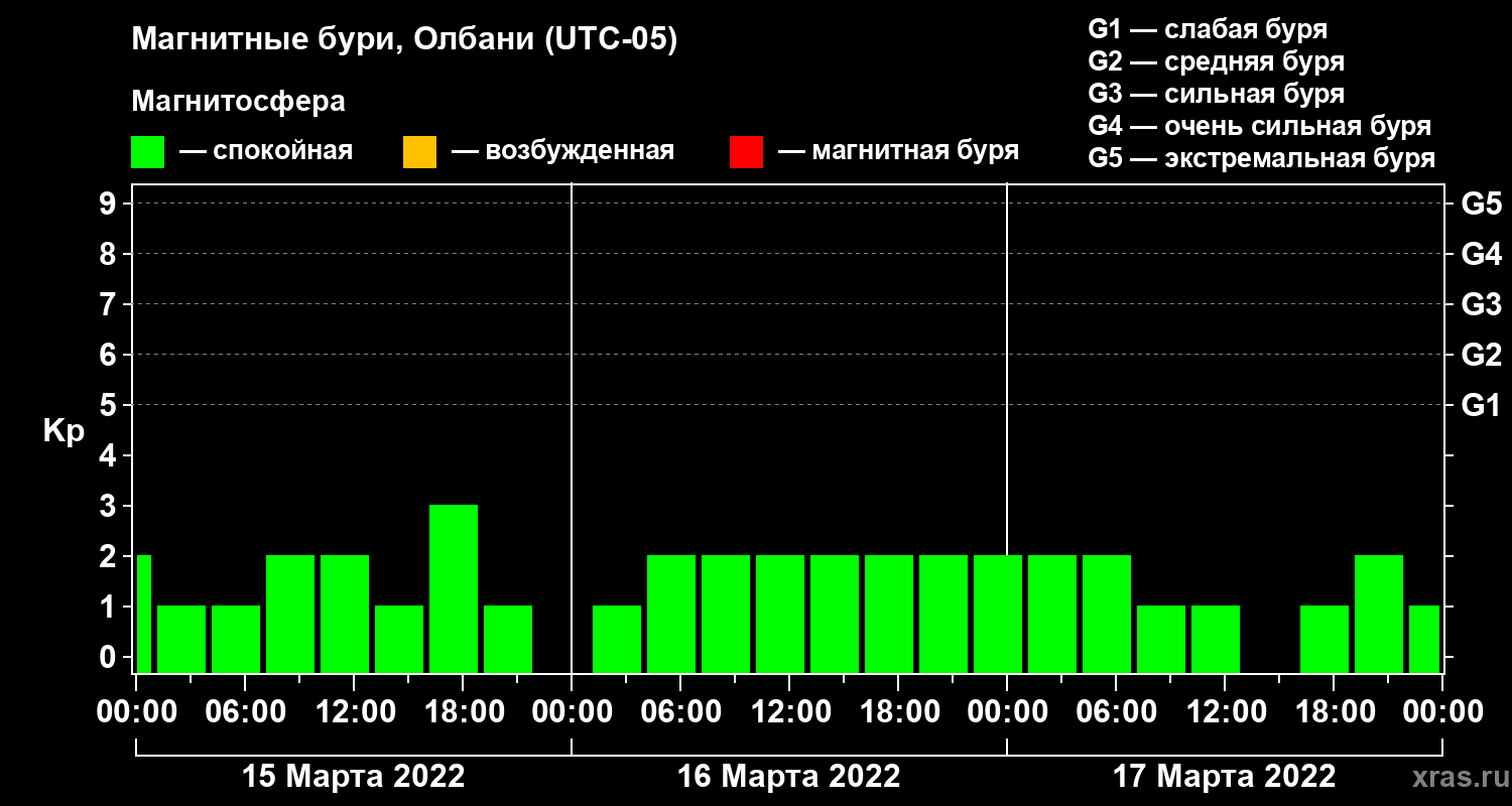 Изменения геомагнитного индекса Kp с 15 по 17 марта 2022 года для средних широт