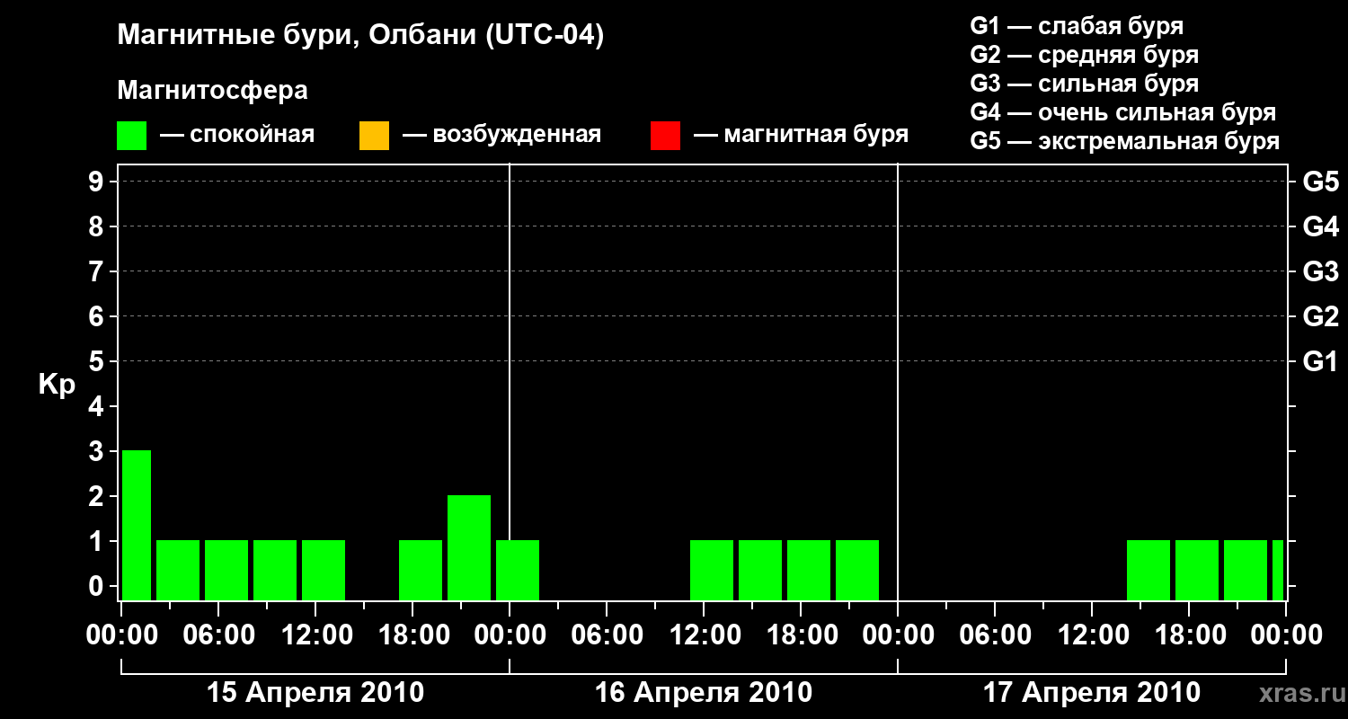 Изменения геомагнитного индекса Kp с 15 по 17 апреля 2010 года для средних широт