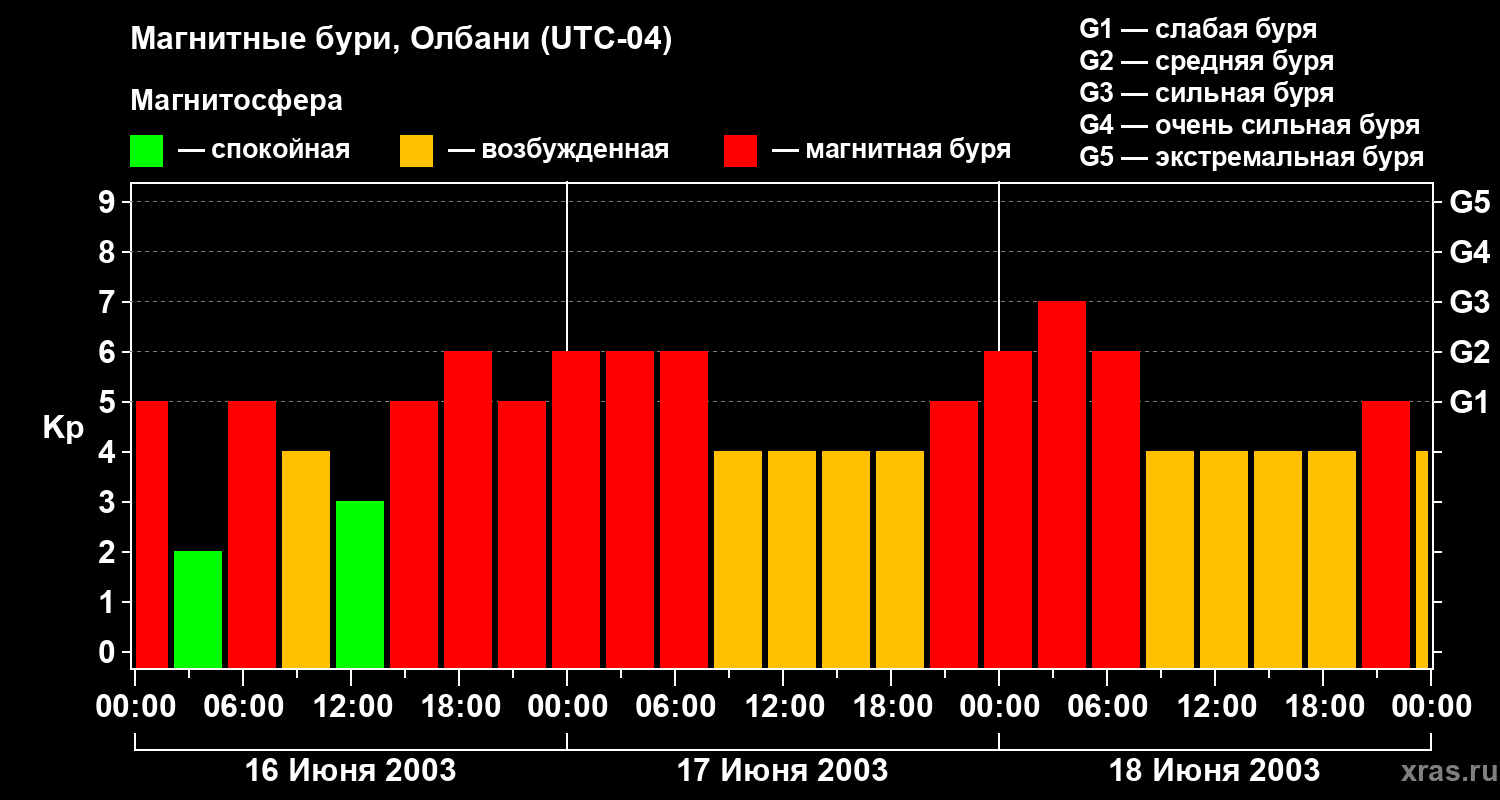 Изменения геомагнитного индекса Kp с 16 по 18 июня 2003 года для средних широт
