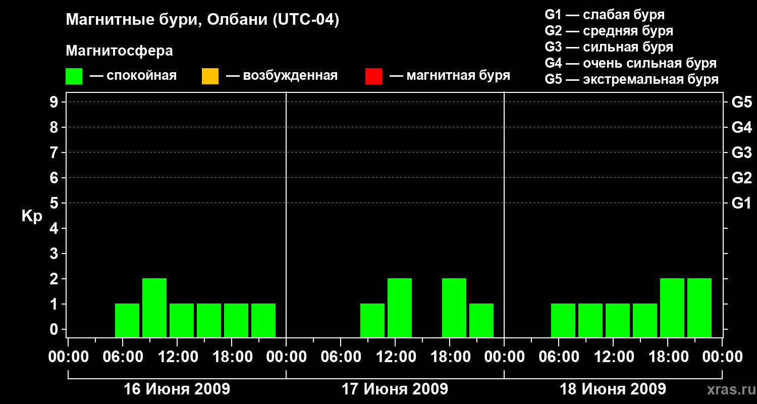 Изменения геомагнитного индекса Kp с 16 по 18 июня 2009 года для средних широт