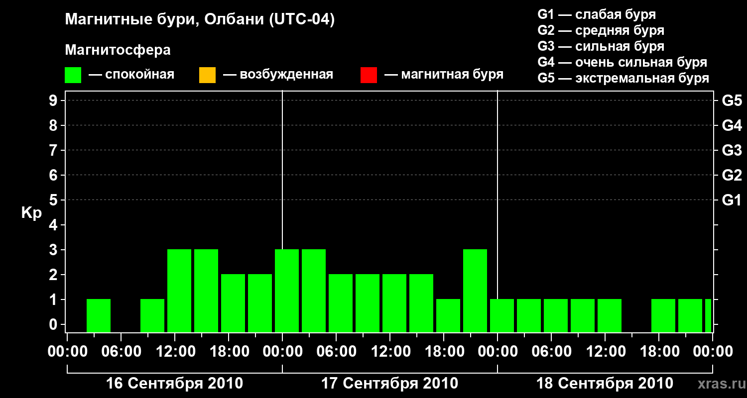 Изменения геомагнитного индекса Kp с 16 по 18 сентября 2010 года для средних широт