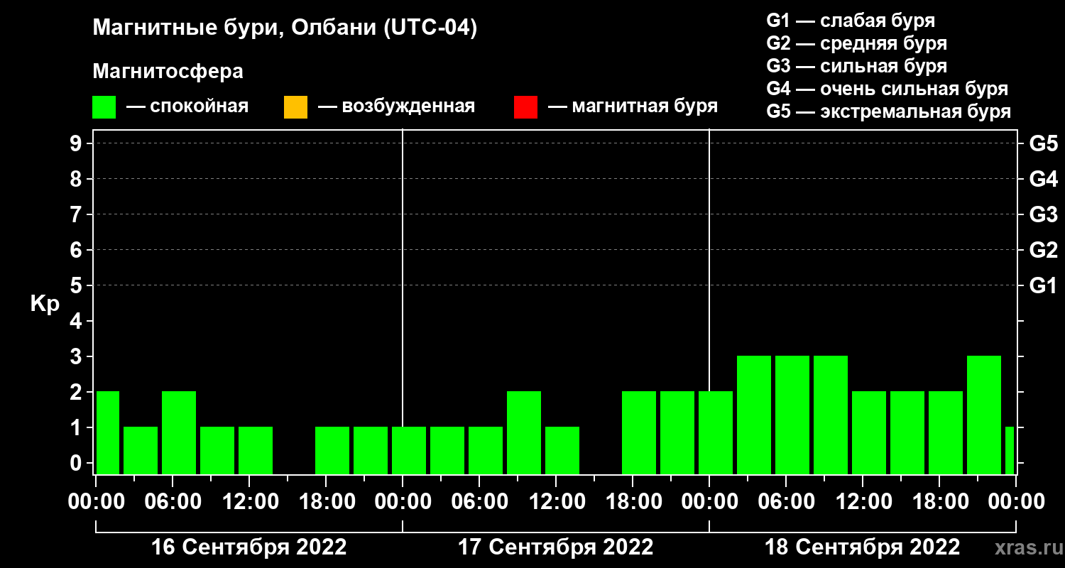 Изменения геомагнитного индекса Kp с 16 по 18 сентября 2022 года для средних широт
