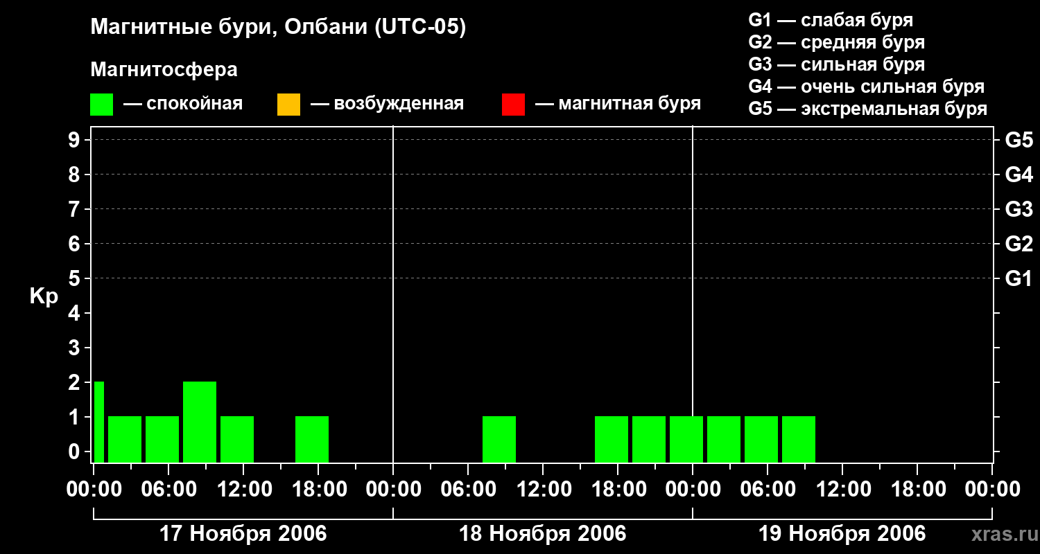 Изменения геомагнитного индекса Kp с 17 по 19 ноября 2006 года для средних широт