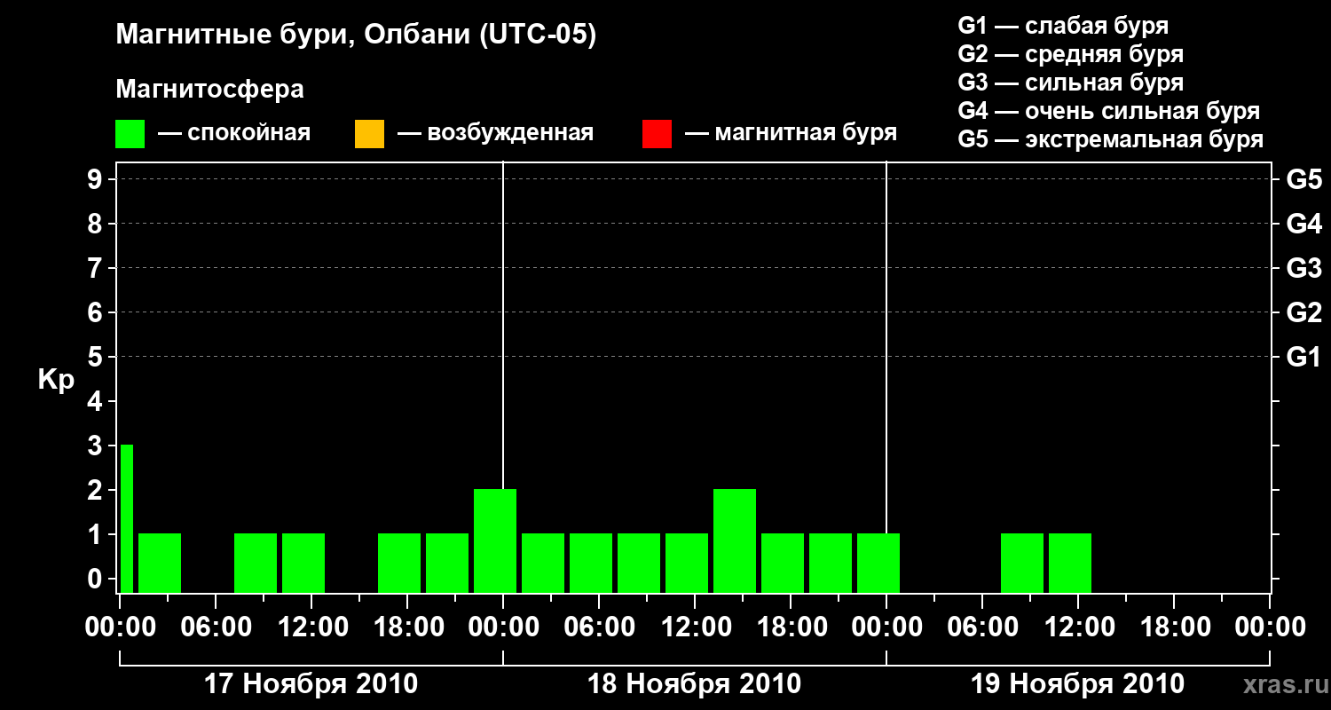 Изменения геомагнитного индекса Kp с 17 по 19 ноября 2010 года для средних широт