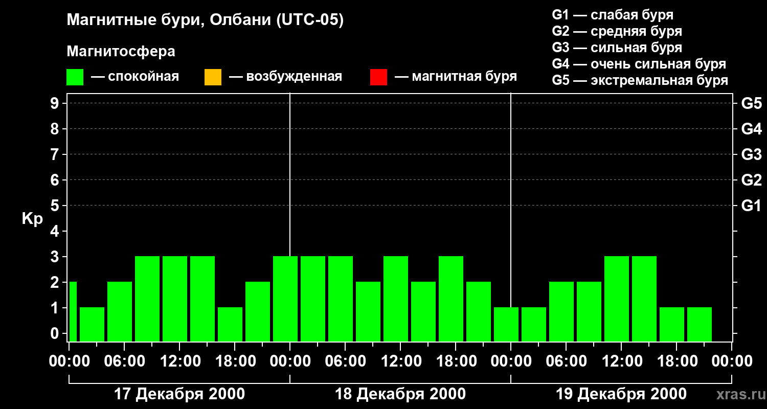 Изменения геомагнитного индекса Kp с 17 по 19 декабря 2000 года для средних широт