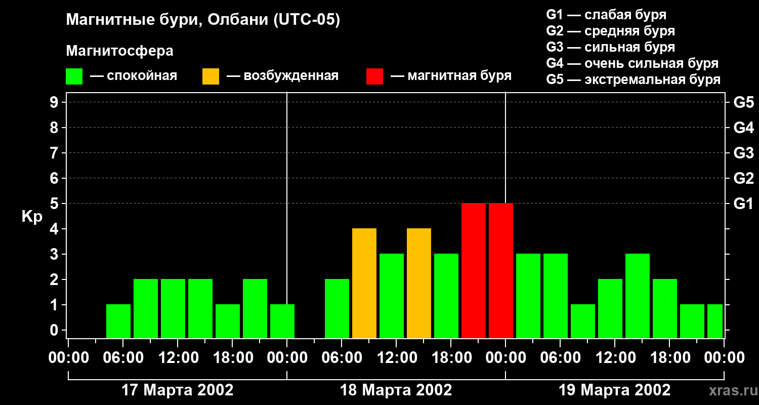 Изменения геомагнитного индекса Kp с 17 по 19 марта 2002 года для средних широт
