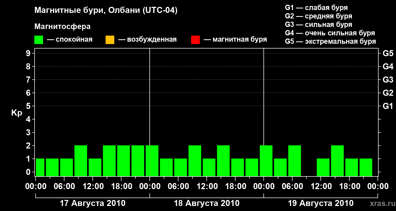Изменения геомагнитного индекса Kp с 17 по 19 августа 2010 года для средних широт