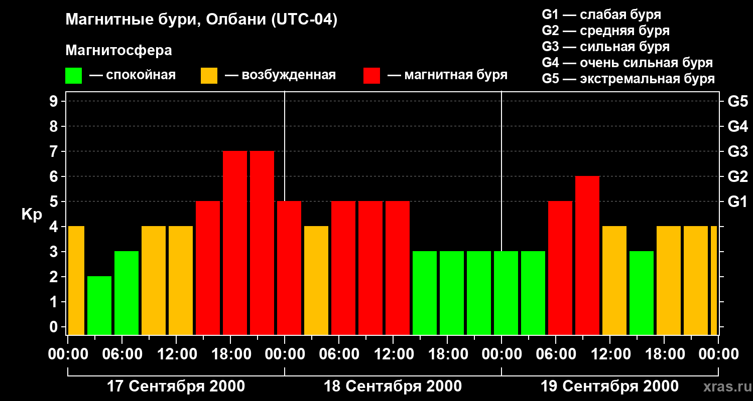 Изменения геомагнитного индекса Kp с 17 по 19 сентября 2000 года для средних широт