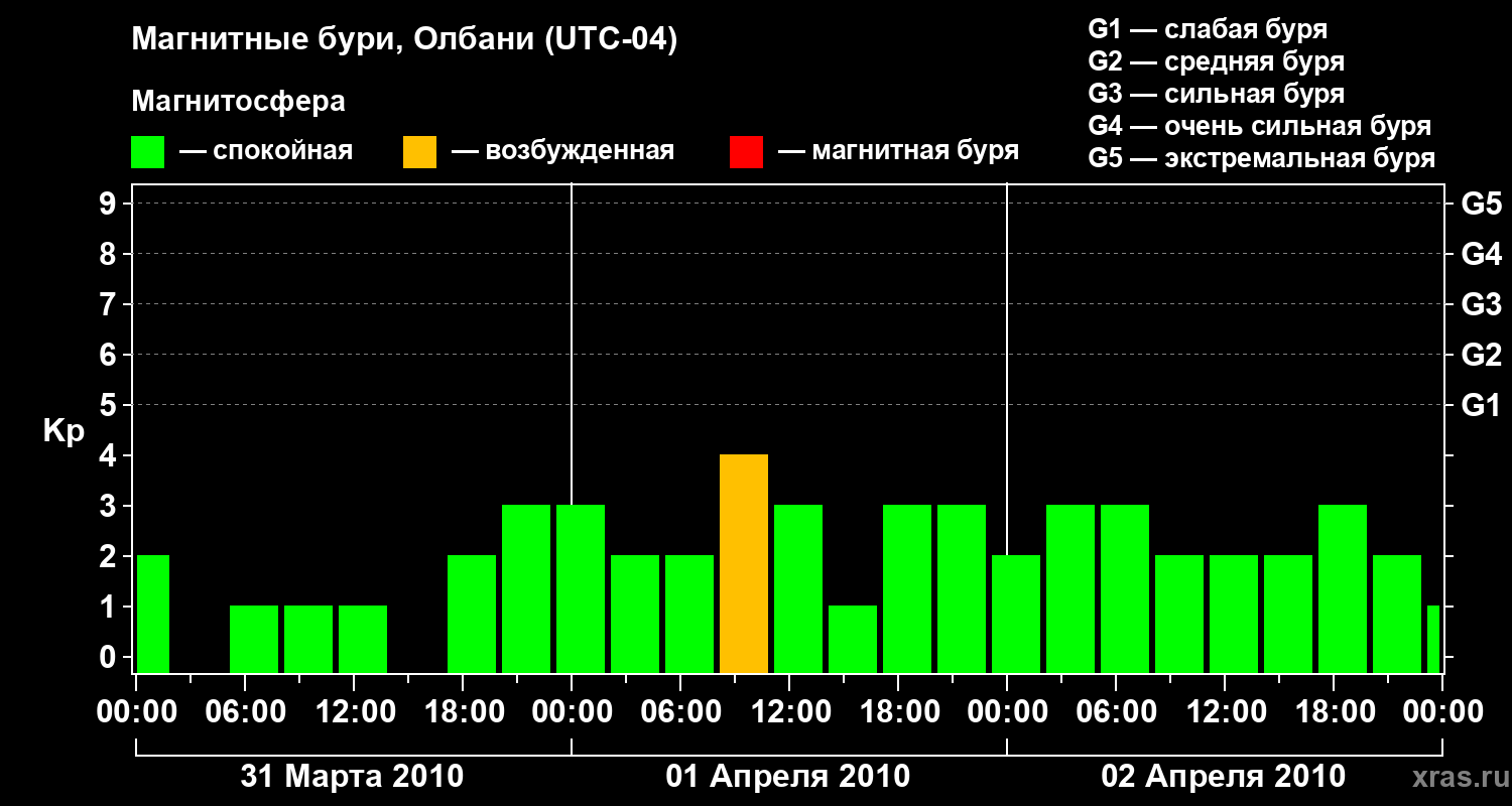 Изменения геомагнитного индекса Kp с 31 марта по 2 апреля 2010 года для средних широт