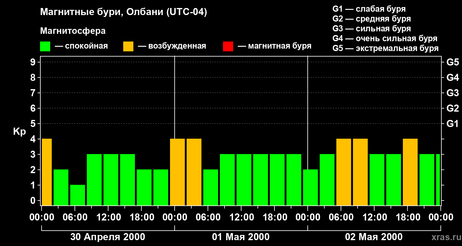 Изменения геомагнитного индекса Kp с 30 апреля по 2 мая 2000 года для средних широт