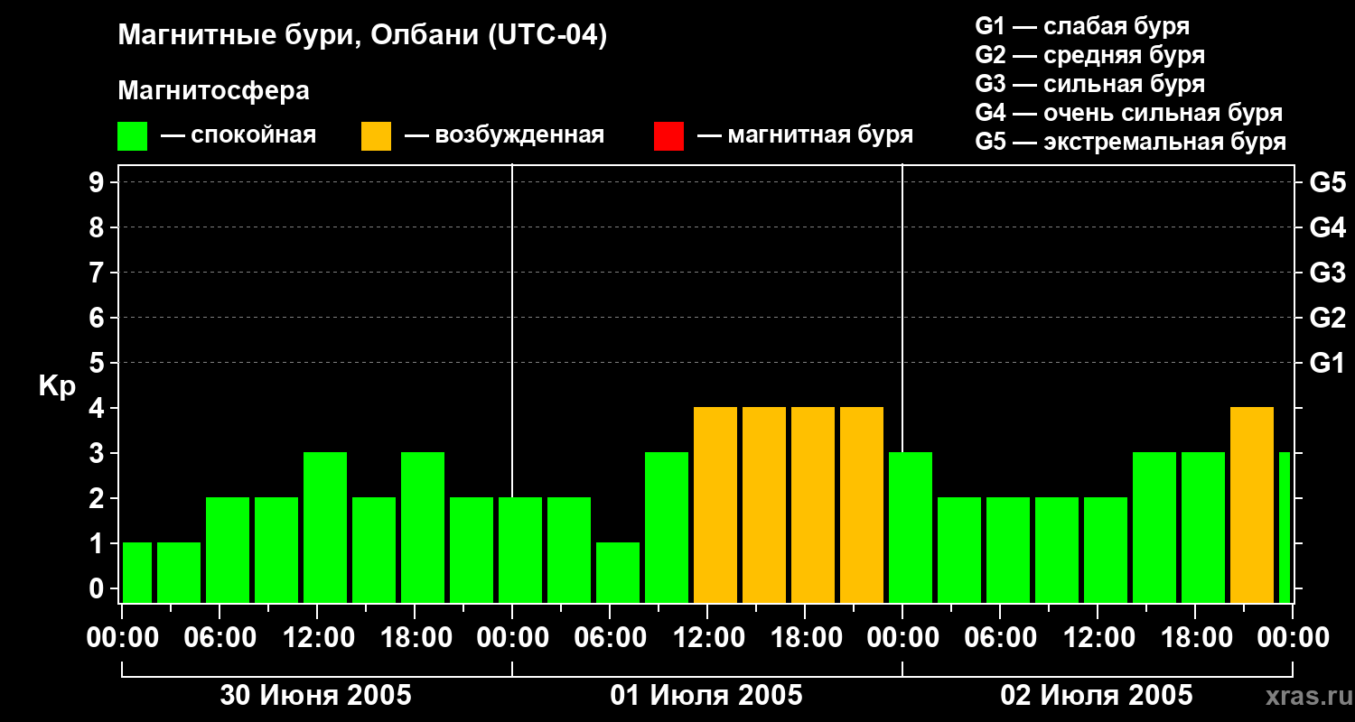 Изменения геомагнитного индекса Kp с 30 июня по 2 июля 2005 года для средних широт
