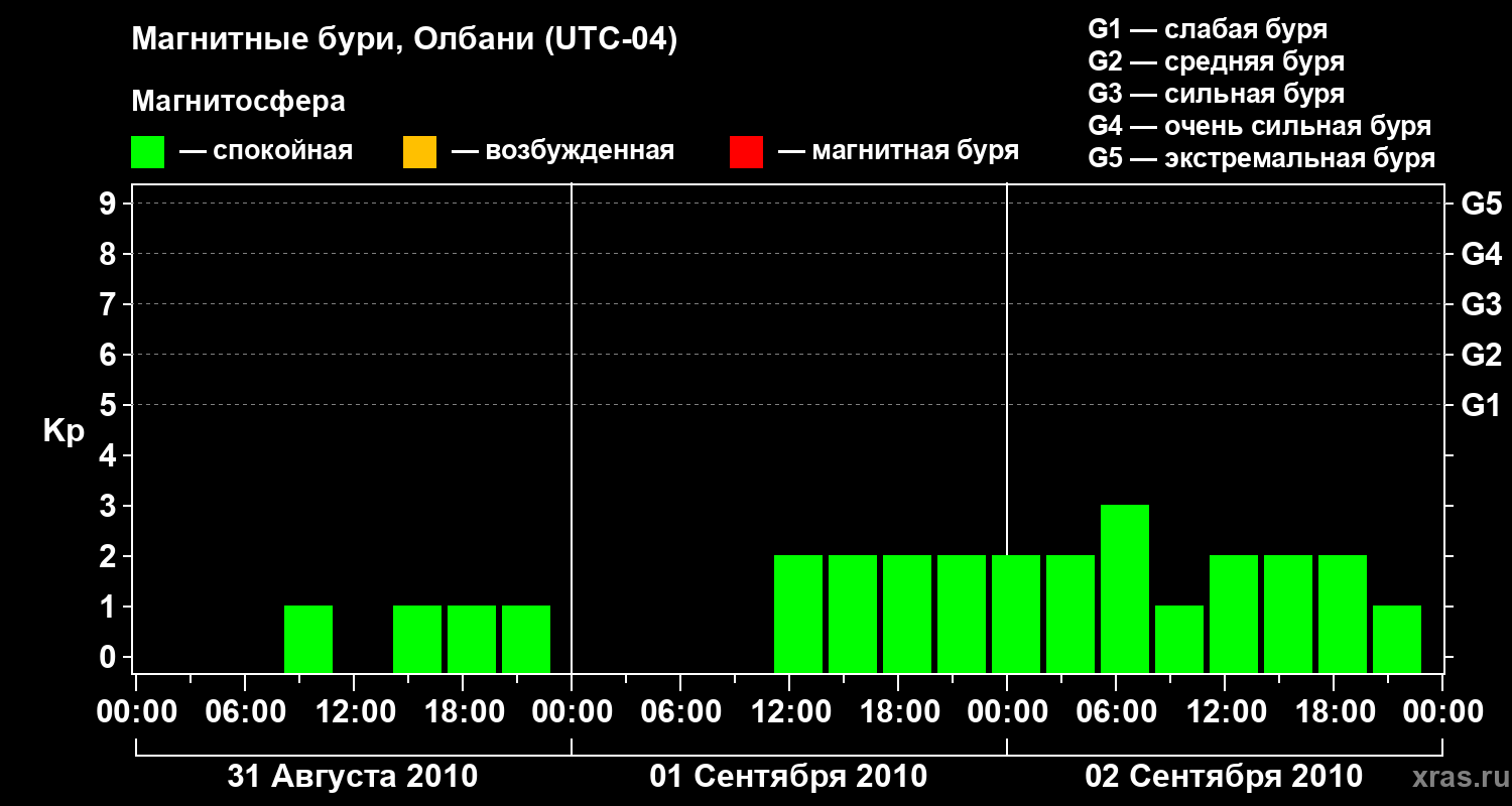 Изменения геомагнитного индекса Kp с 31 августа по 2 сентября 2010 года для средних широт