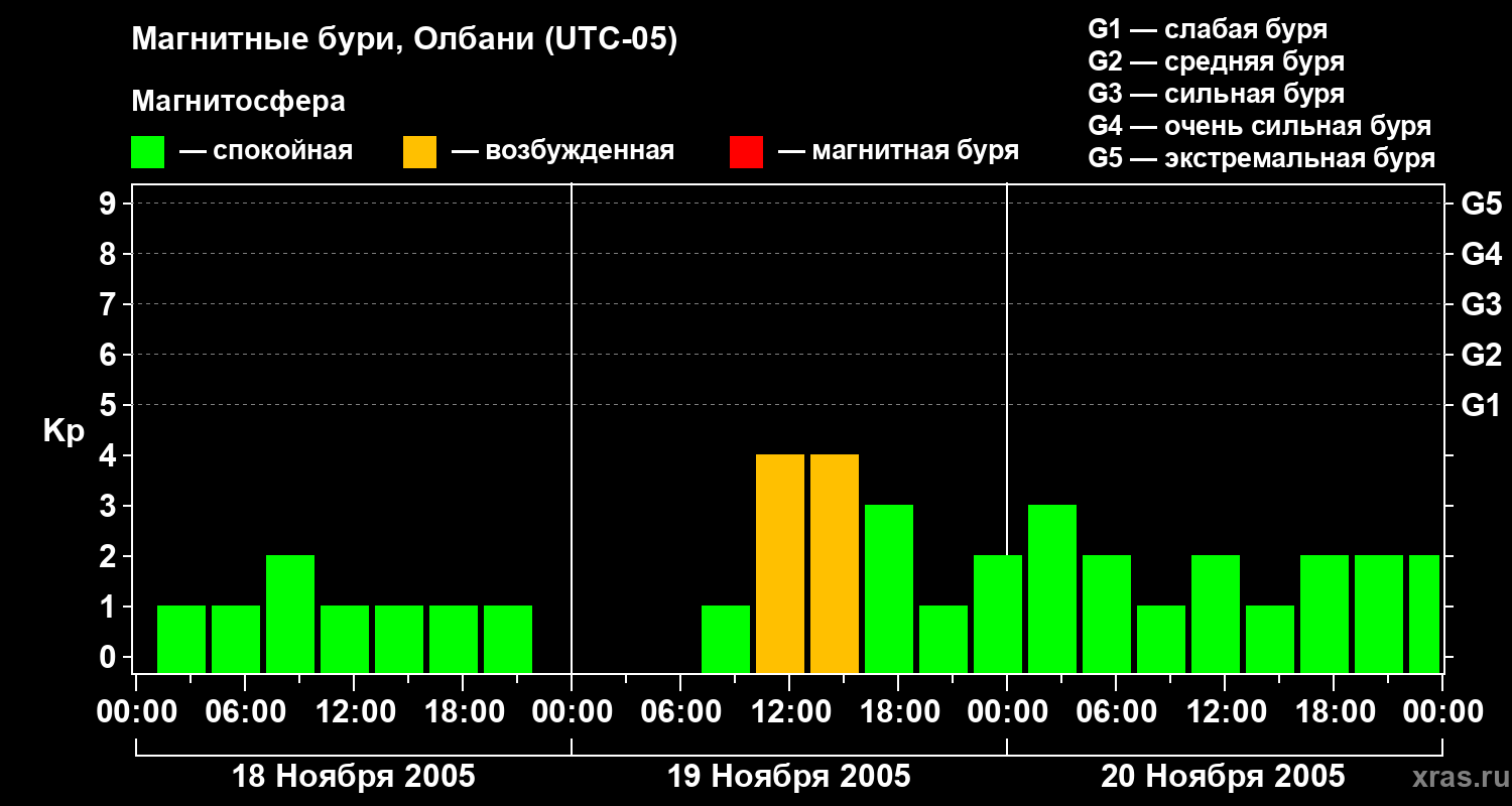 Изменения геомагнитного индекса Kp с 18 по 20 ноября 2005 года для средних широт