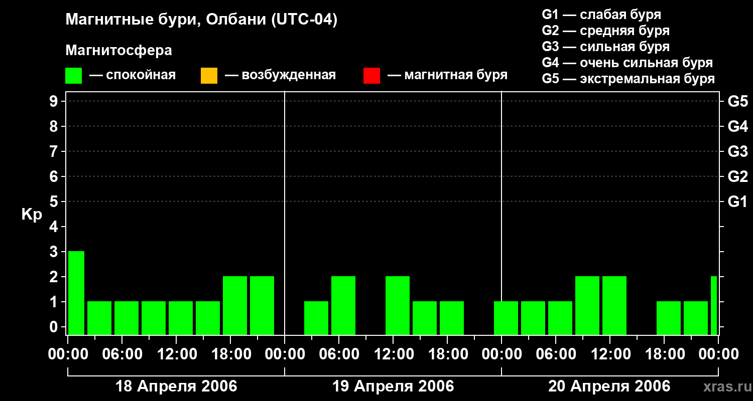 Изменения геомагнитного индекса Kp с 18 по 20 апреля 2006 года для средних широт