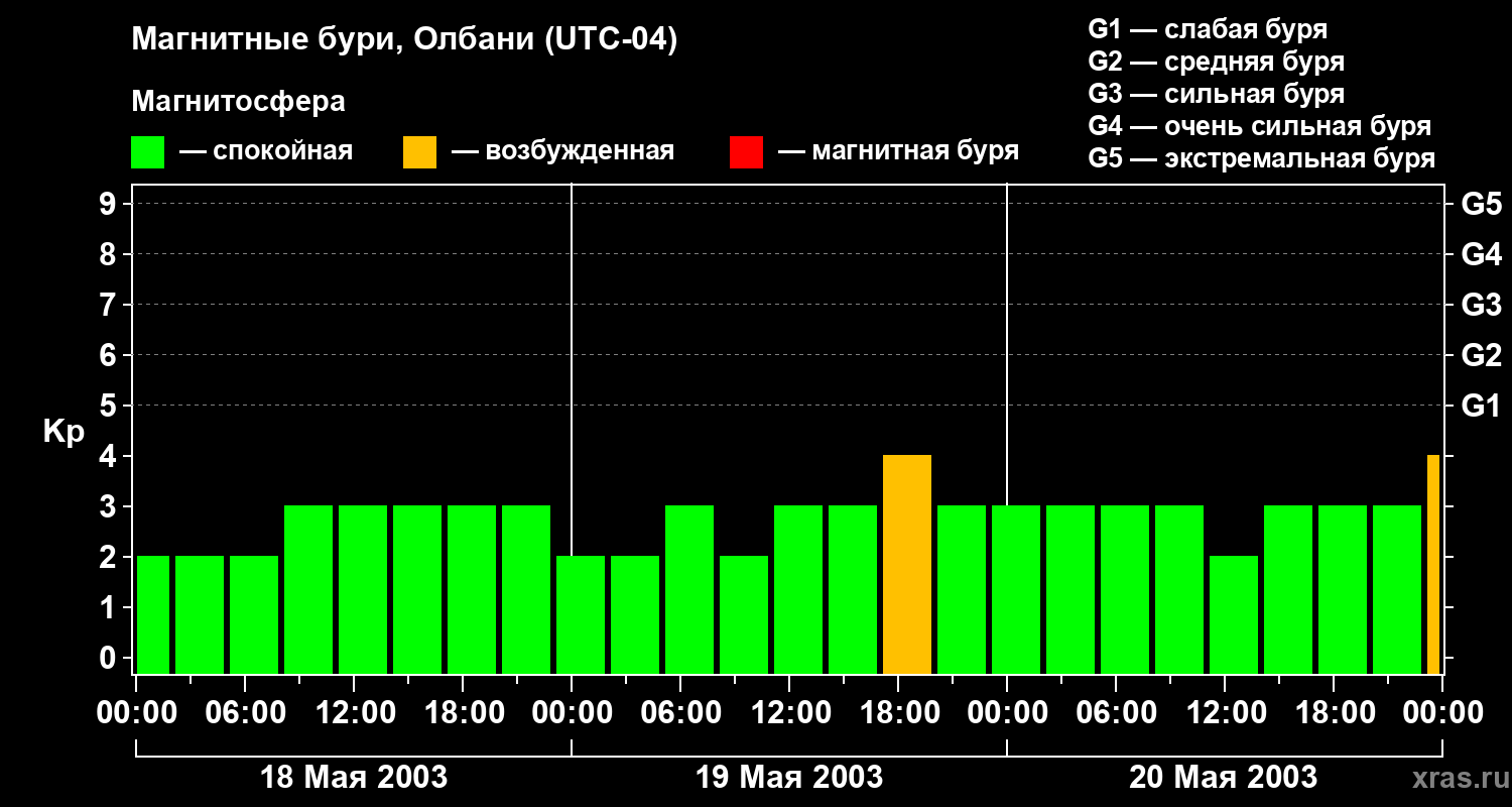 Изменения геомагнитного индекса Kp с 18 по 20 мая 2003 года для средних широт