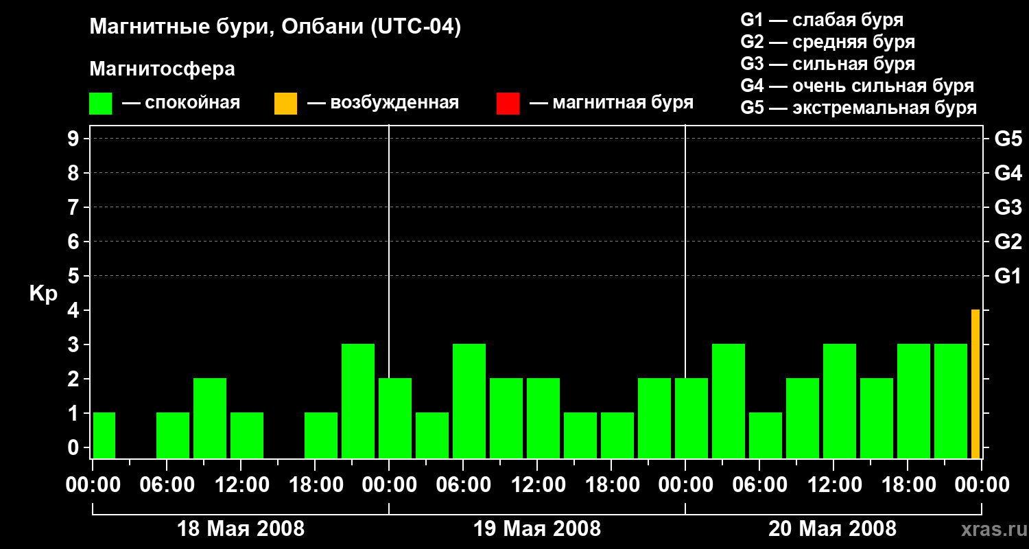 Изменения геомагнитного индекса Kp с 18 по 20 мая 2008 года для средних широт