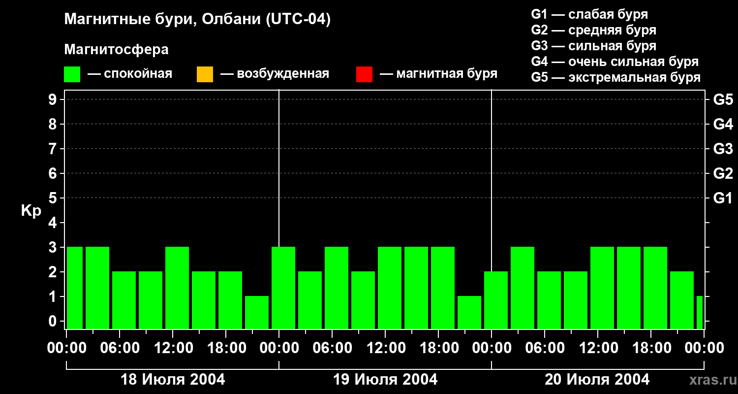 Изменения геомагнитного индекса Kp с 18 по 20 июля 2004 года для средних широт