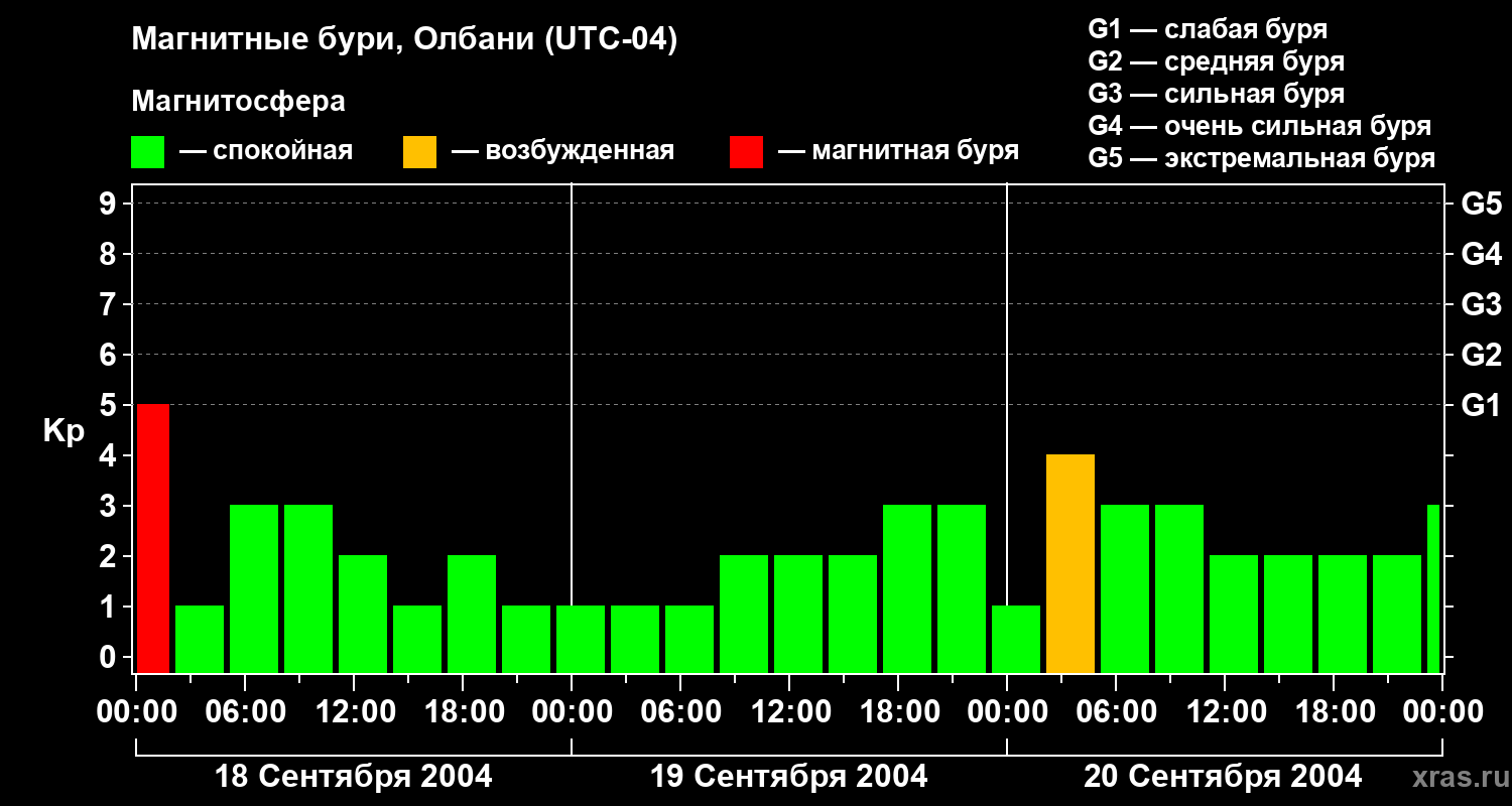 Изменения геомагнитного индекса Kp с 18 по 20 сентября 2004 года для средних широт