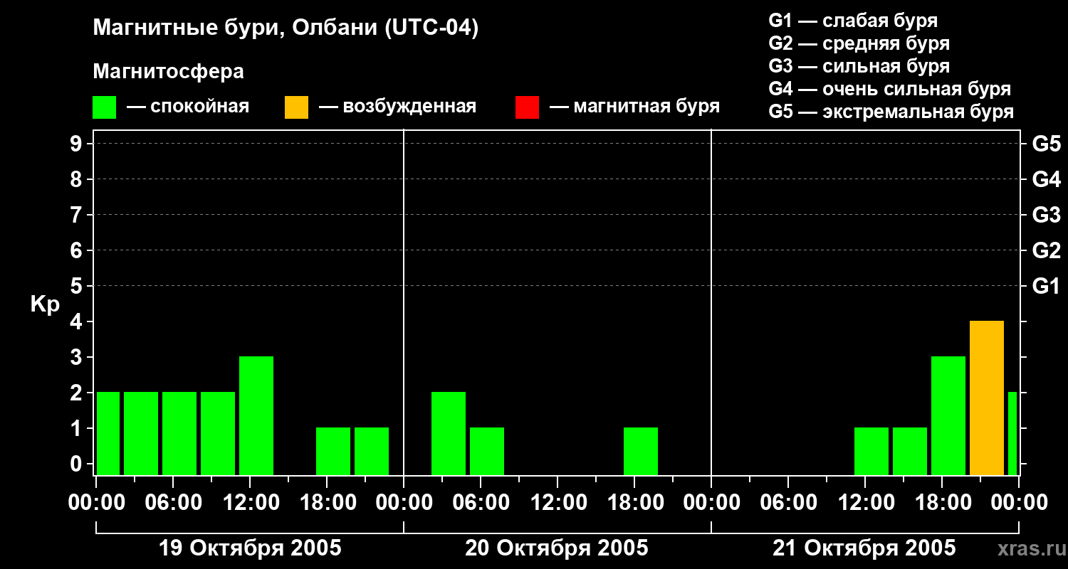 Изменения геомагнитного индекса Kp с 19 по 21 октября 2005 года для средних широт