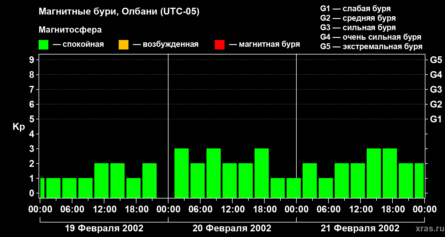 Изменения геомагнитного индекса Kp с 19 по 21 февраля 2002 года для средних широт