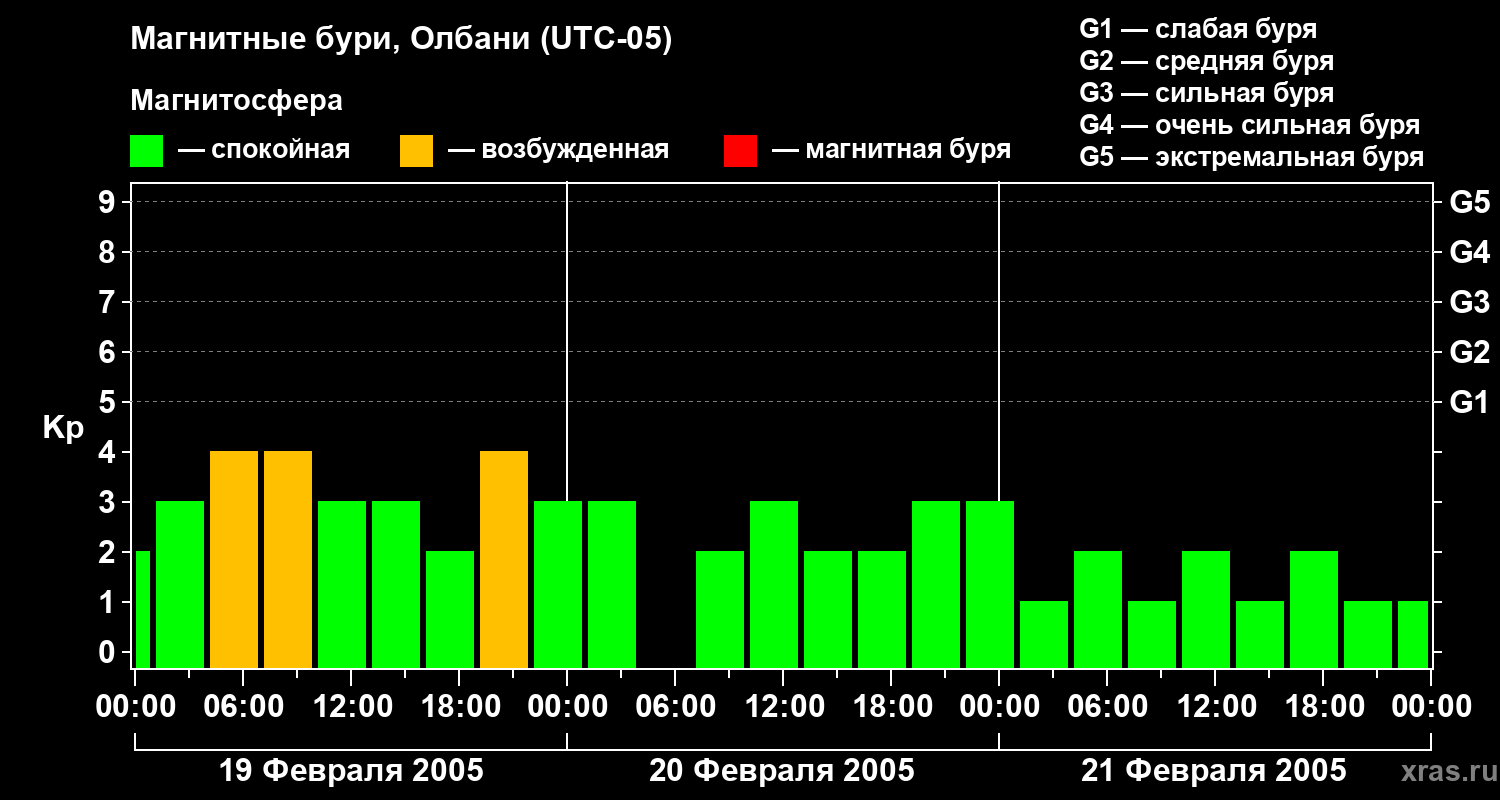 Изменения геомагнитного индекса Kp с 19 по 21 февраля 2005 года для средних широт