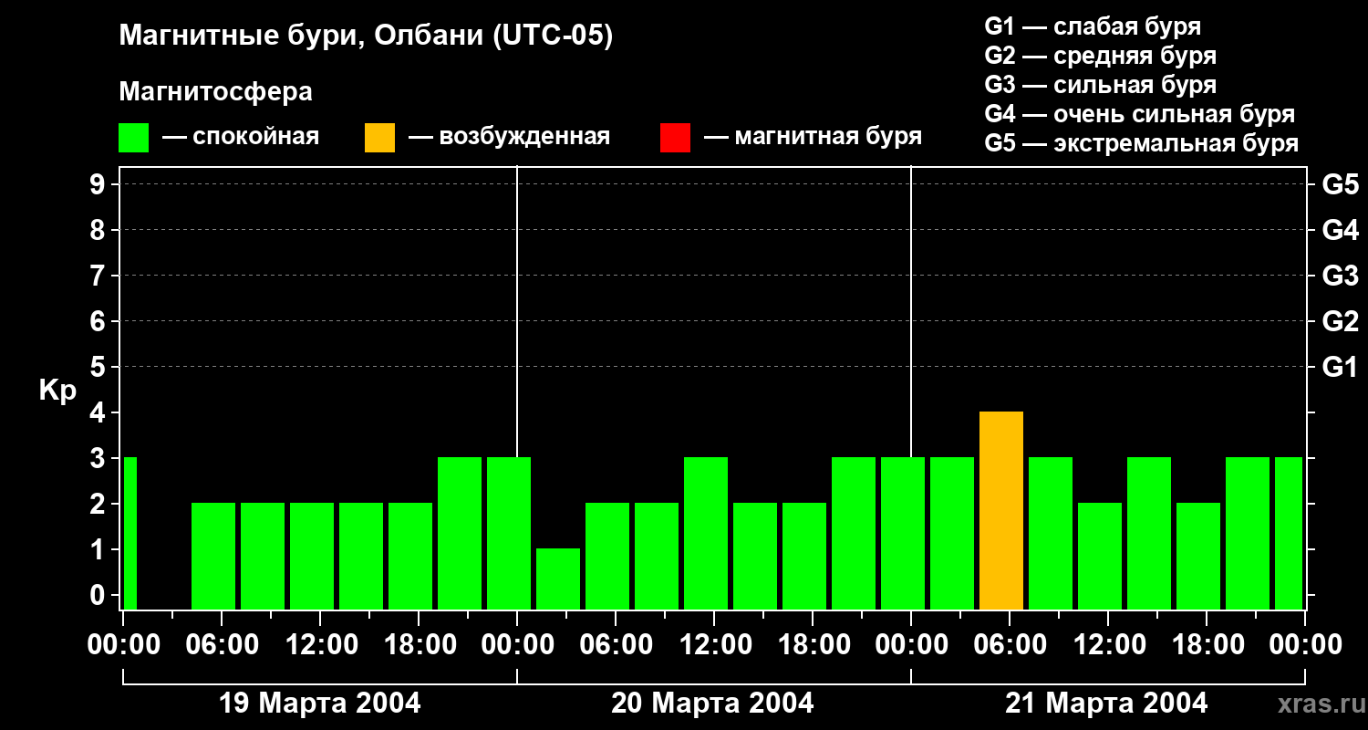 Изменения геомагнитного индекса Kp с 19 по 21 марта 2004 года для средних широт