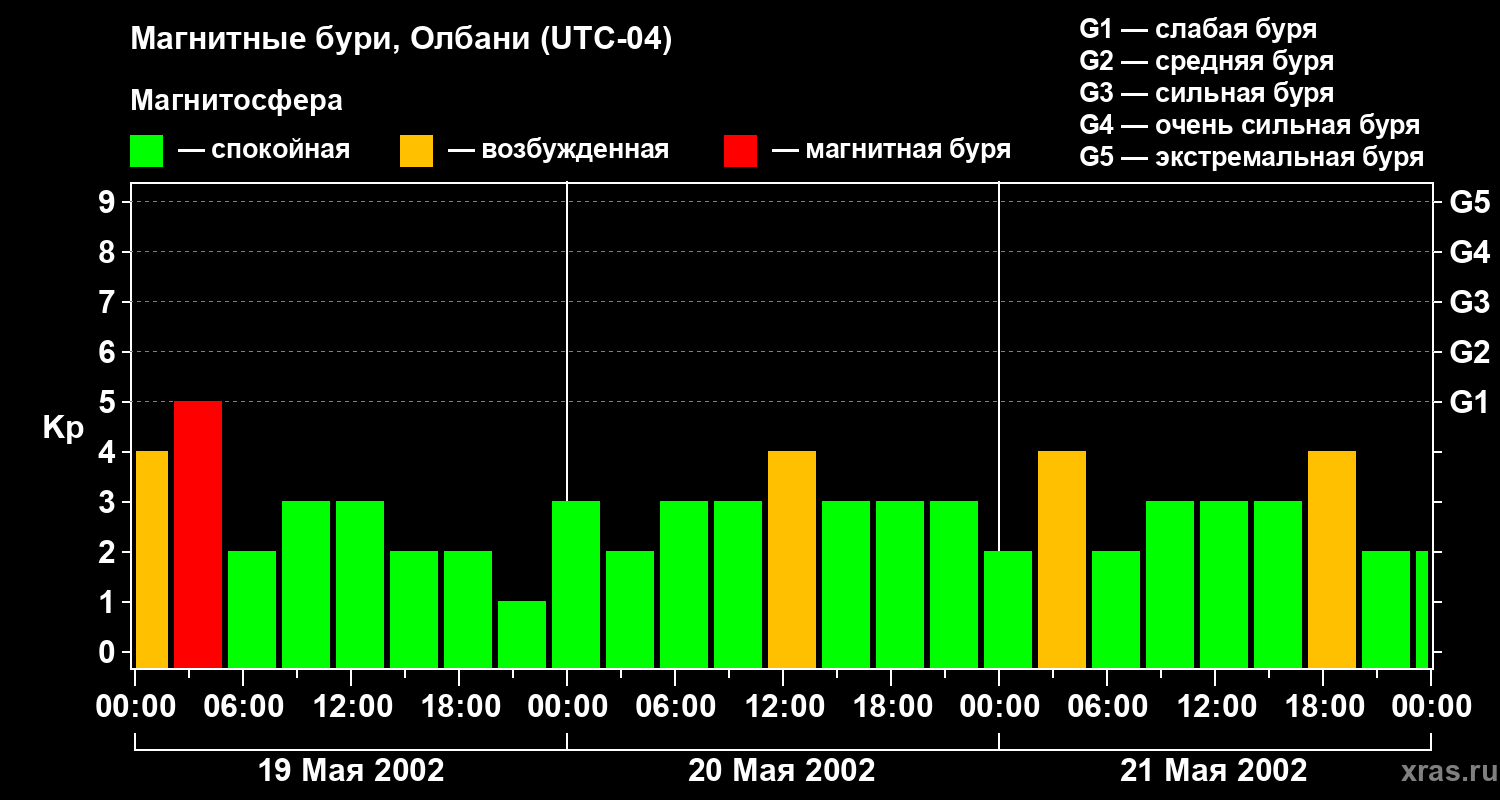Изменения геомагнитного индекса Kp с 19 по 21 мая 2002 года для средних широт