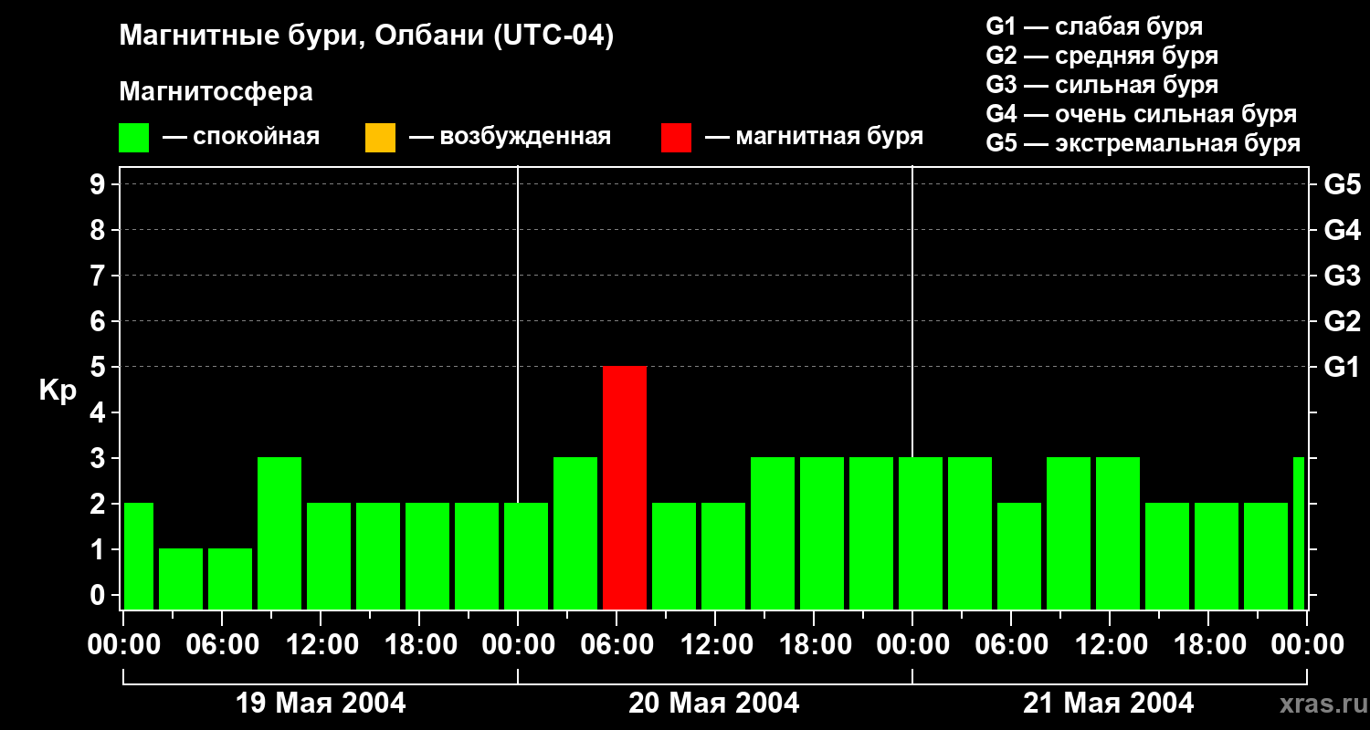 Изменения геомагнитного индекса Kp с 19 по 21 мая 2004 года для средних широт