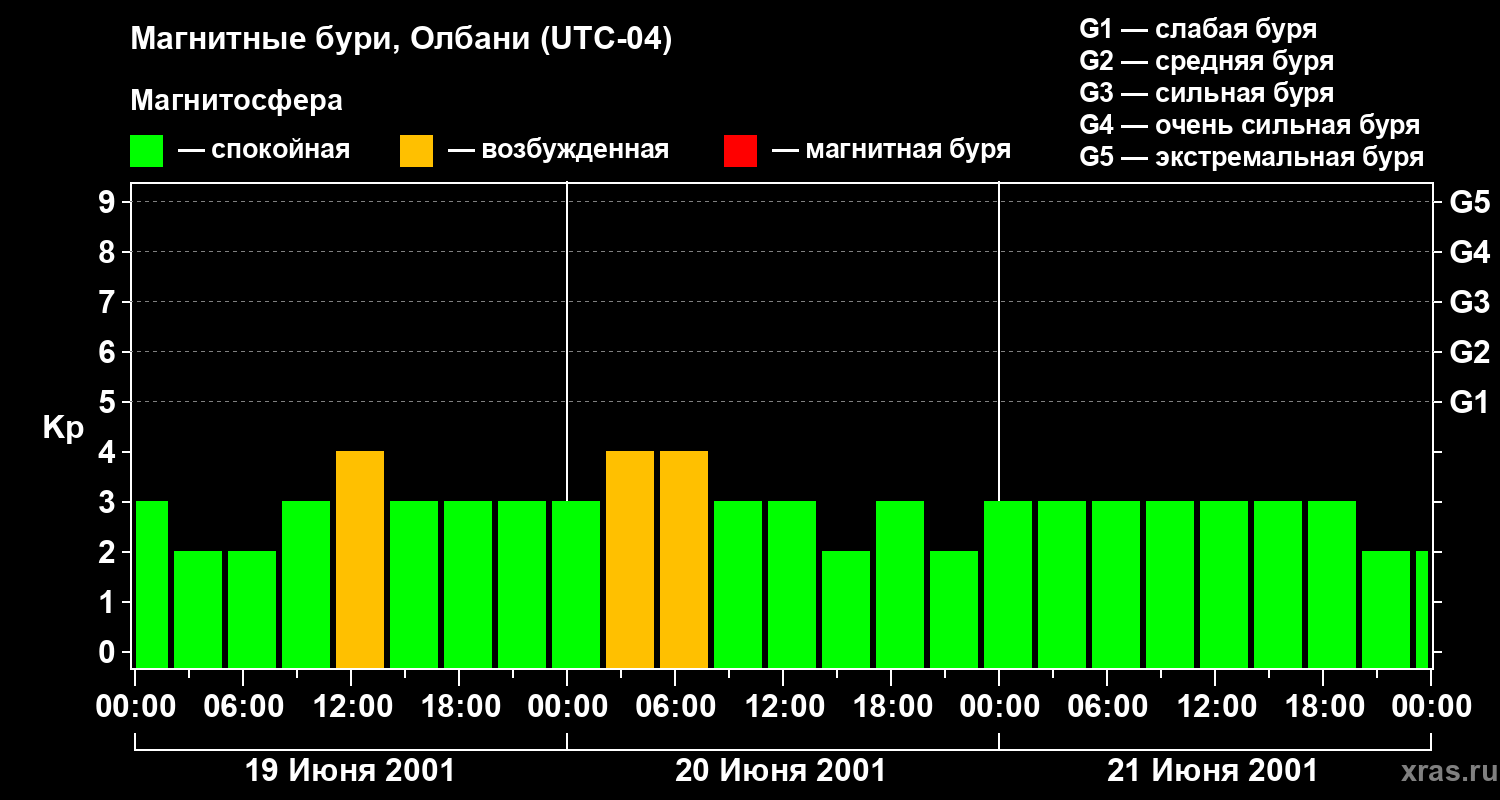 Изменения геомагнитного индекса Kp с 19 по 21 июня 2001 года для средних широт