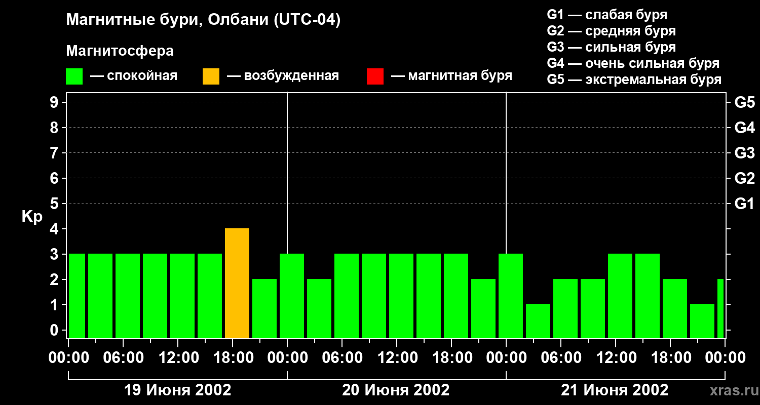 Изменения геомагнитного индекса Kp с 19 по 21 июня 2002 года для средних широт