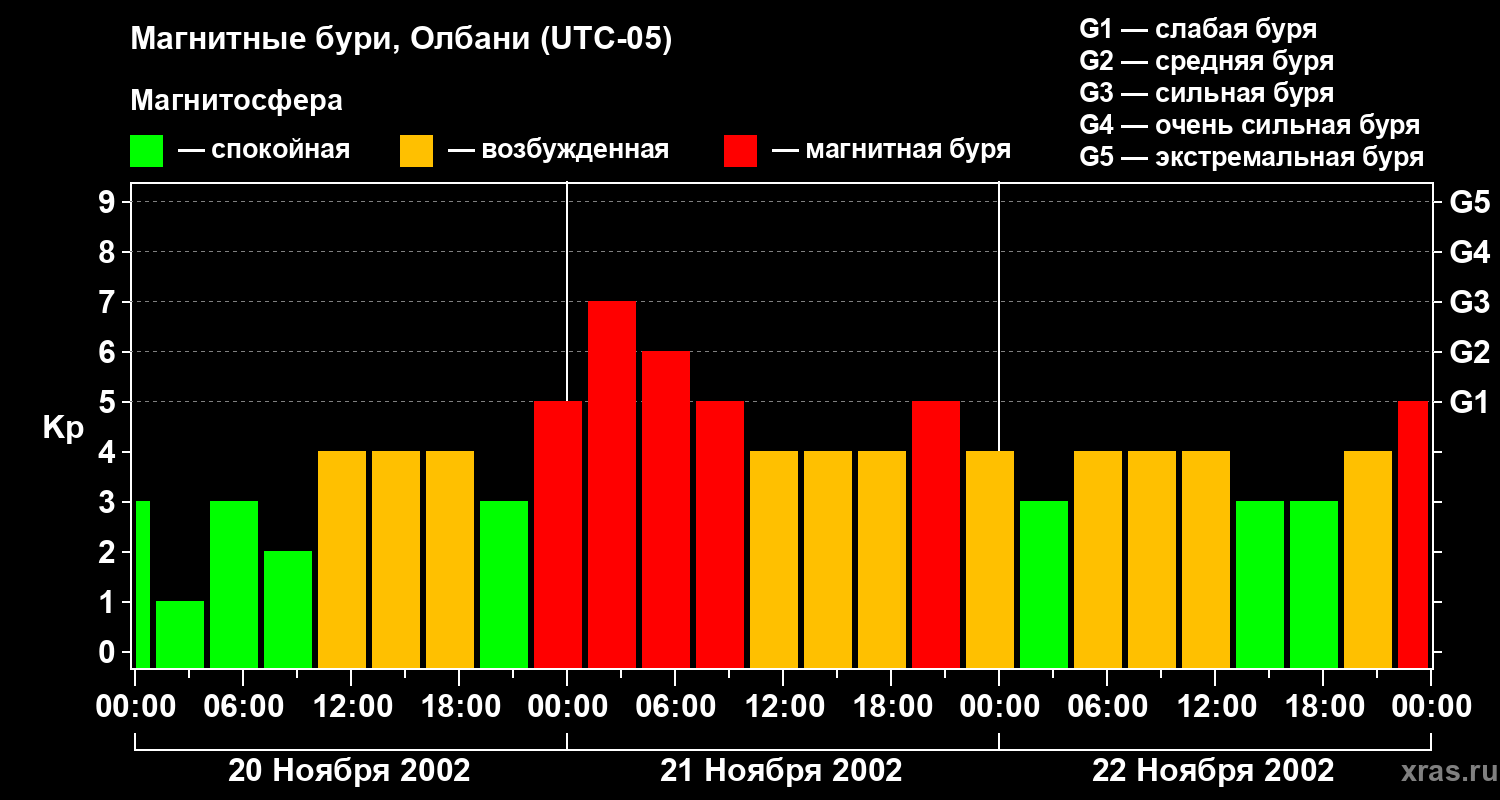 Изменения геомагнитного индекса Kp с 20 по 22 ноября 2002 года для средних широт