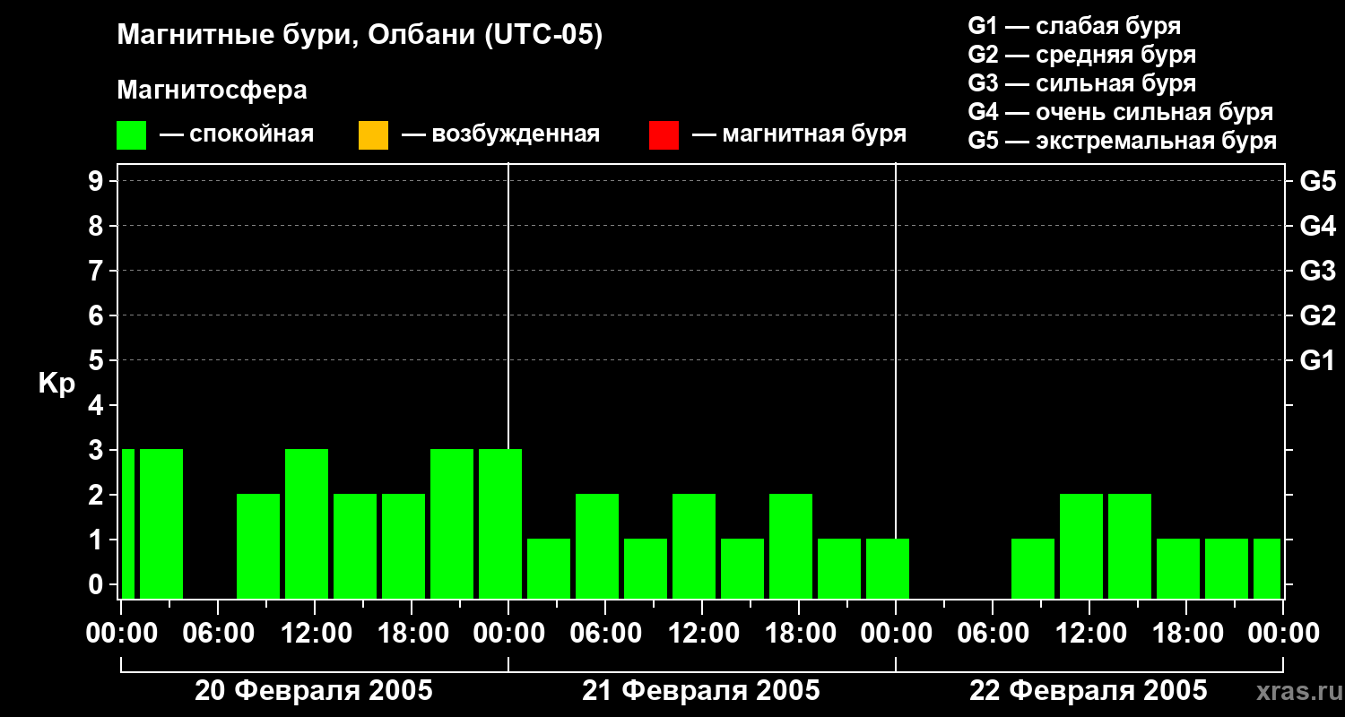 Изменения геомагнитного индекса Kp с 20 по 22 февраля 2005 года для средних широт