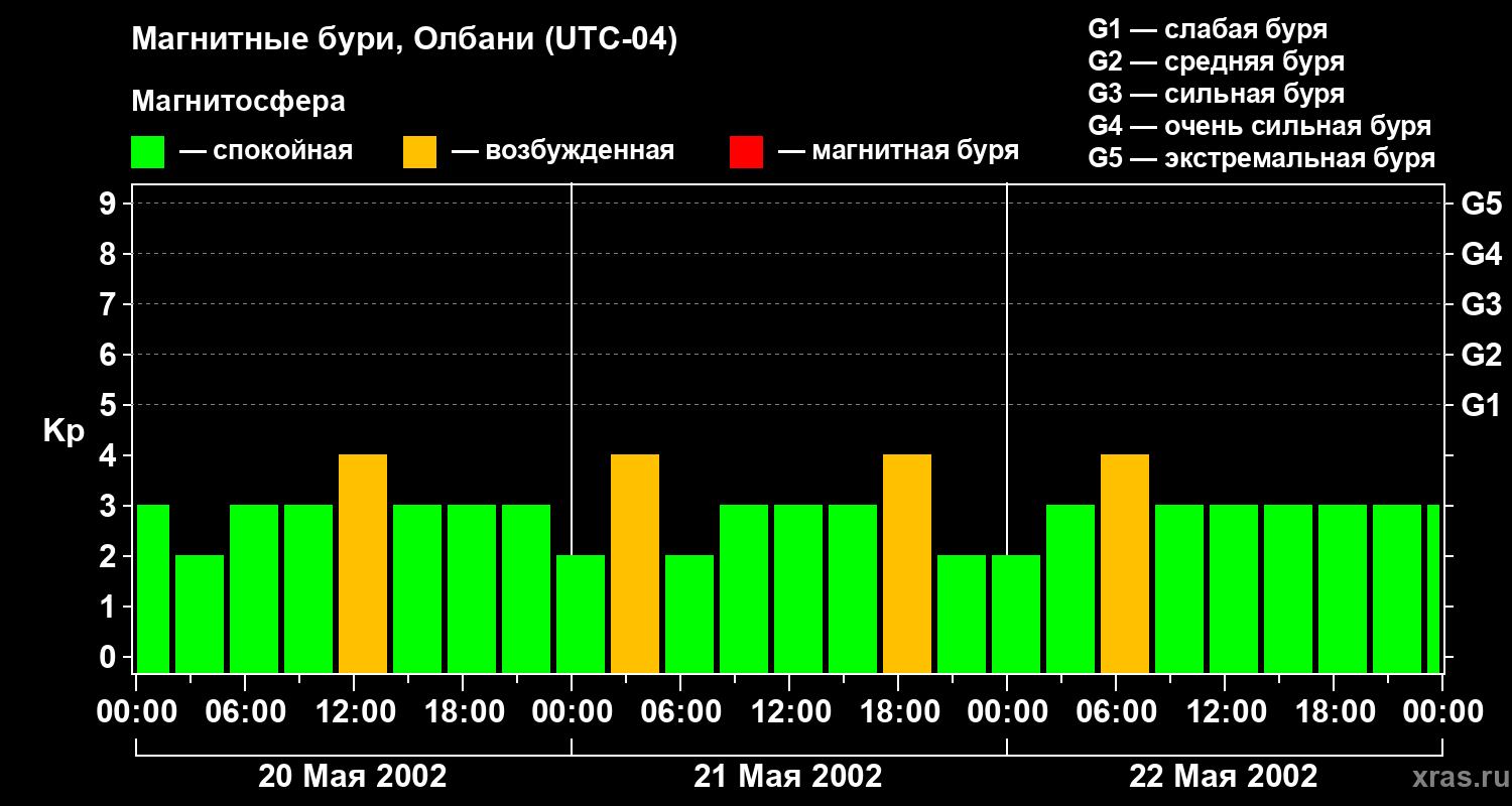 Изменения геомагнитного индекса Kp с 20 по 22 мая 2002 года для средних широт