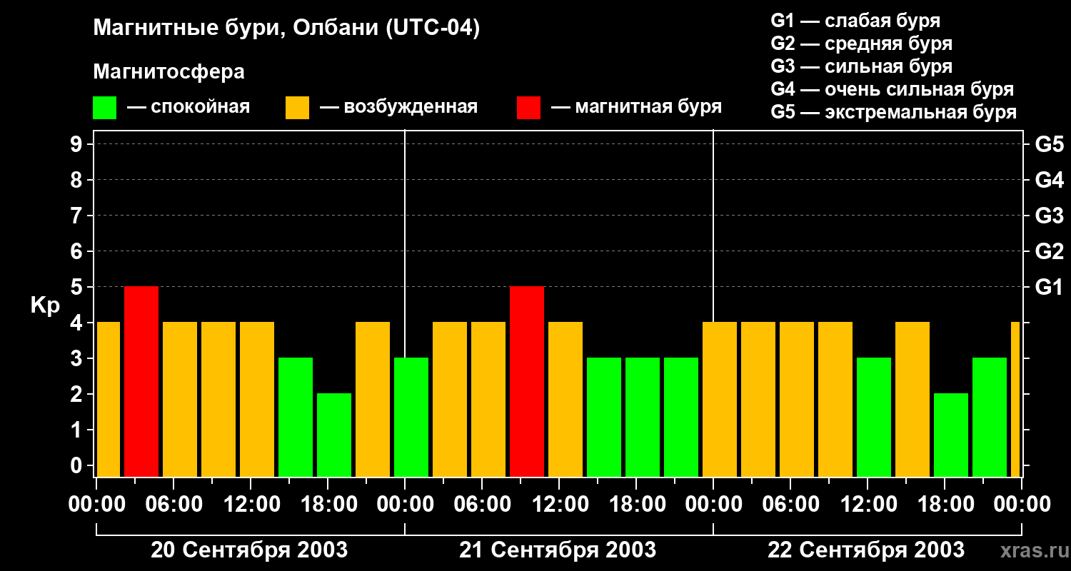 Изменения геомагнитного индекса Kp с 20 по 22 сентября 2003 года для средних широт