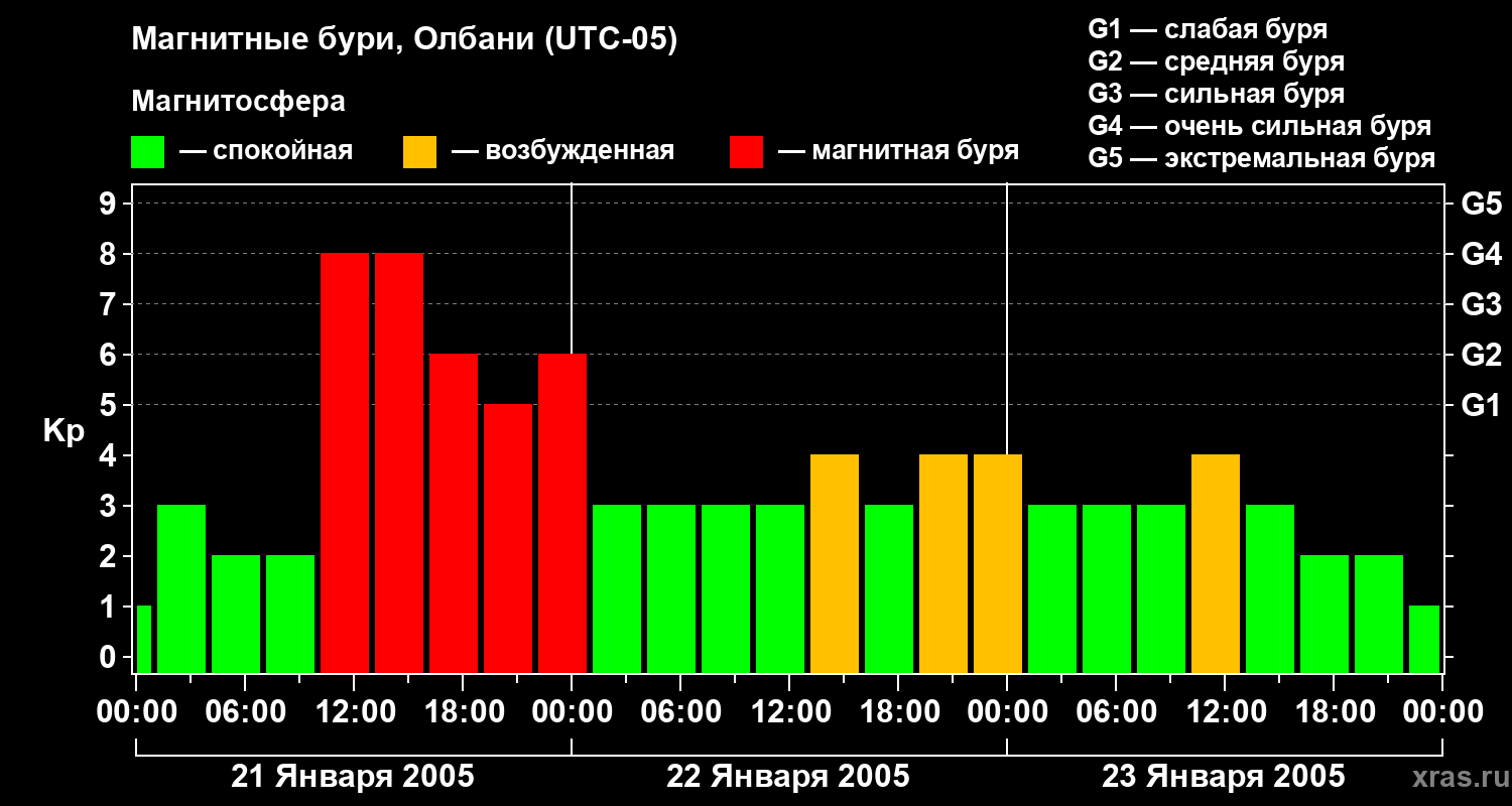 Изменения геомагнитного индекса Kp с 21 по 23 января 2005 года для средних широт
