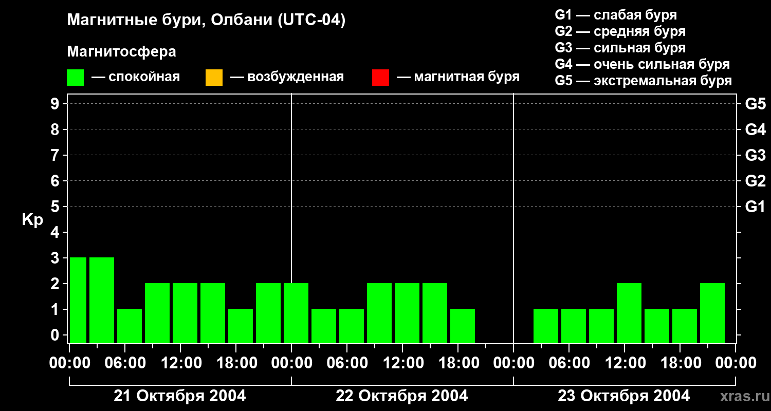 Изменения геомагнитного индекса Kp с 21 по 23 октября 2004 года для средних широт