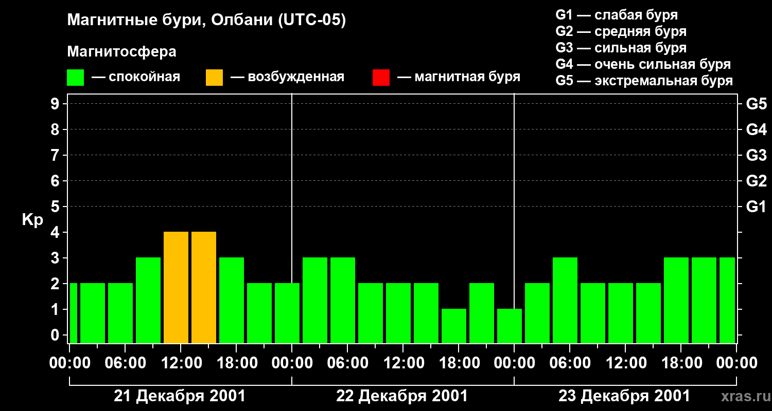 Изменения геомагнитного индекса Kp с 21 по 23 декабря 2001 года для средних широт