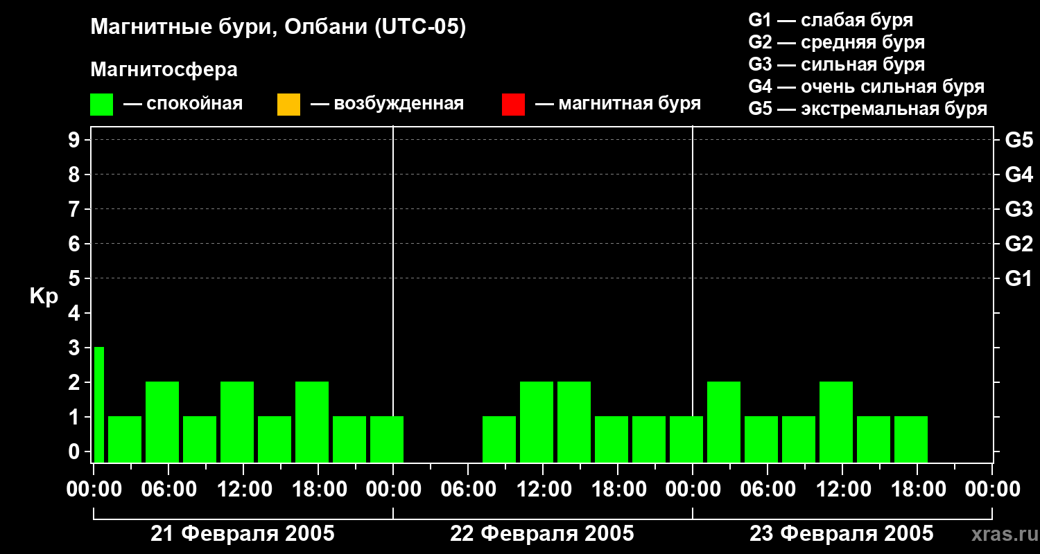 Изменения геомагнитного индекса Kp с 21 по 23 февраля 2005 года для средних широт