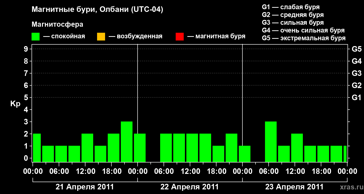 Изменения геомагнитного индекса Kp с 21 по 23 апреля 2011 года для средних широт