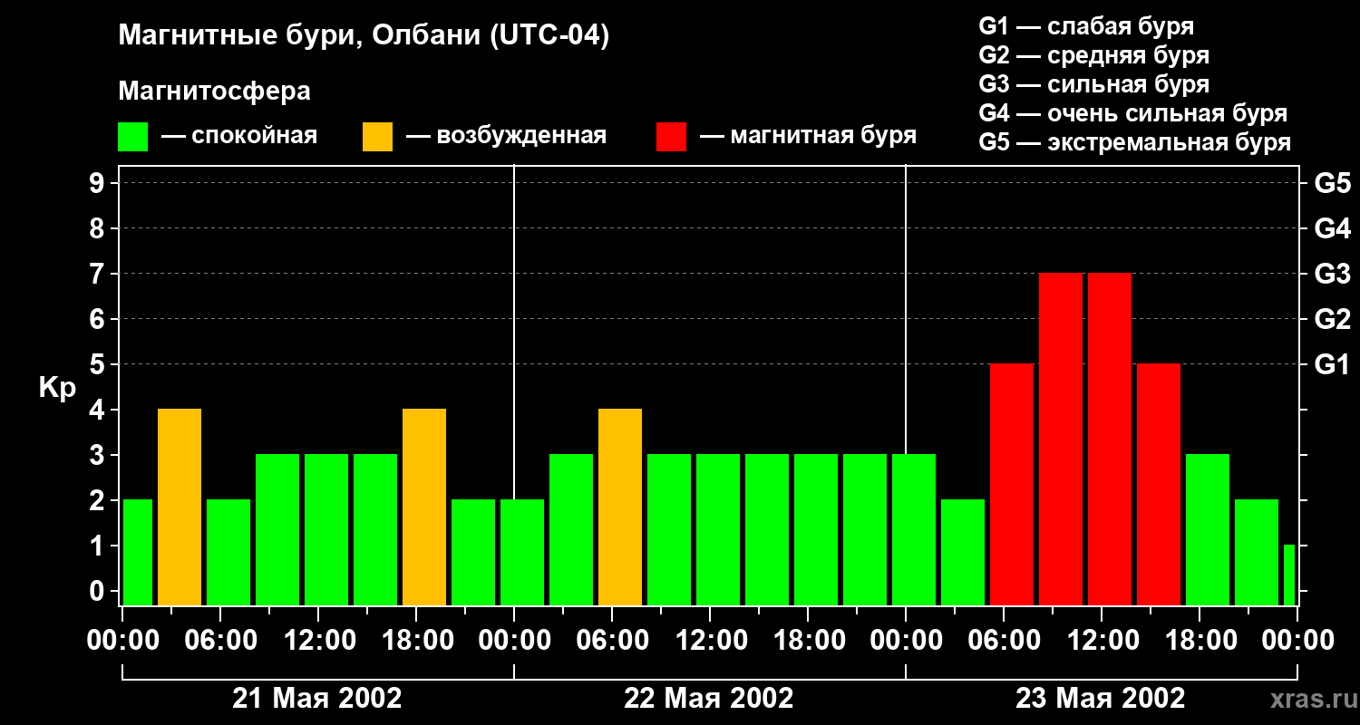 Изменения геомагнитного индекса Kp с 21 по 23 мая 2002 года для средних широт