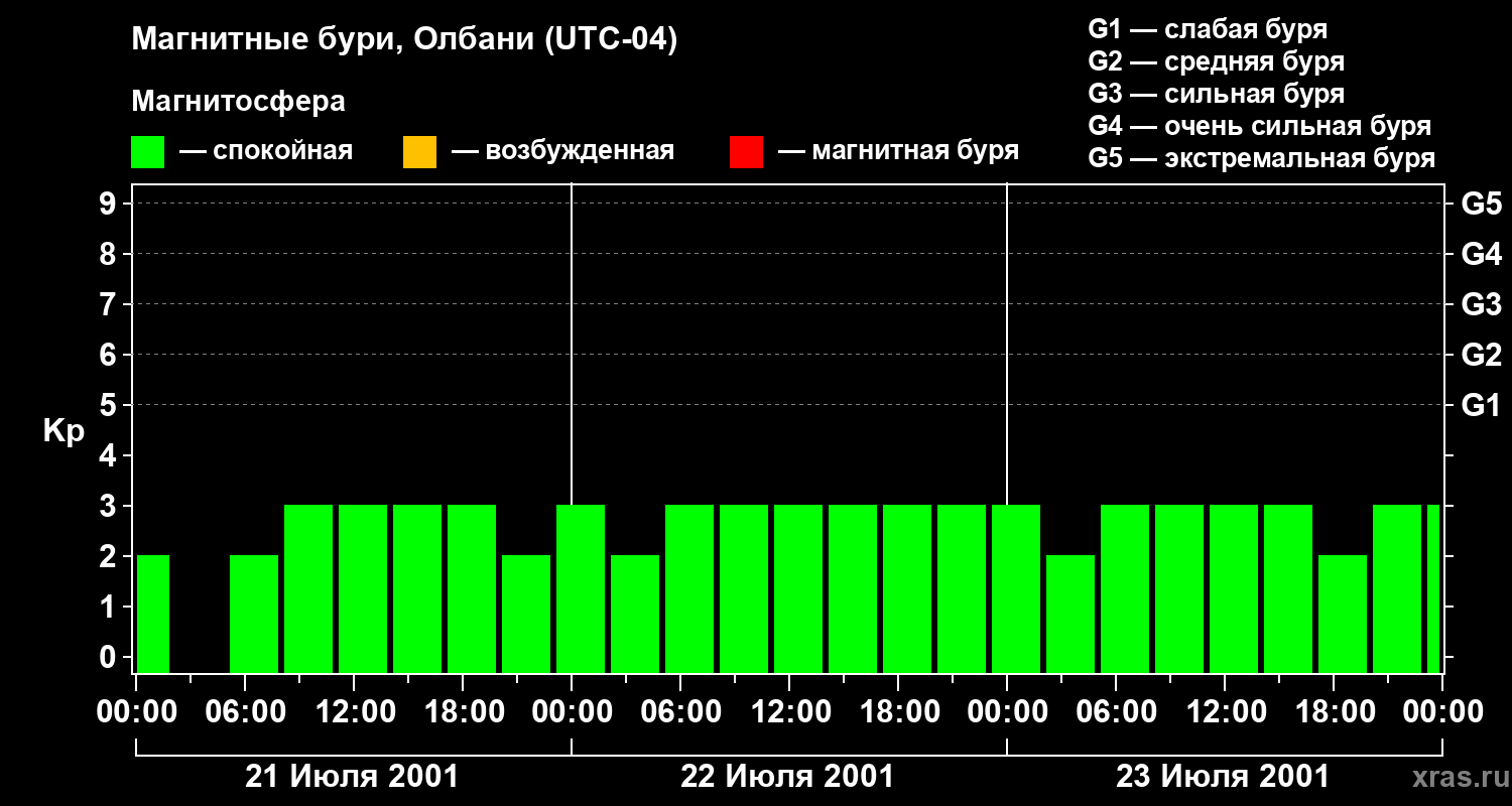 Изменения геомагнитного индекса Kp с 21 по 23 июля 2001 года для средних широт